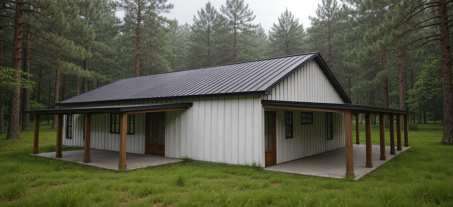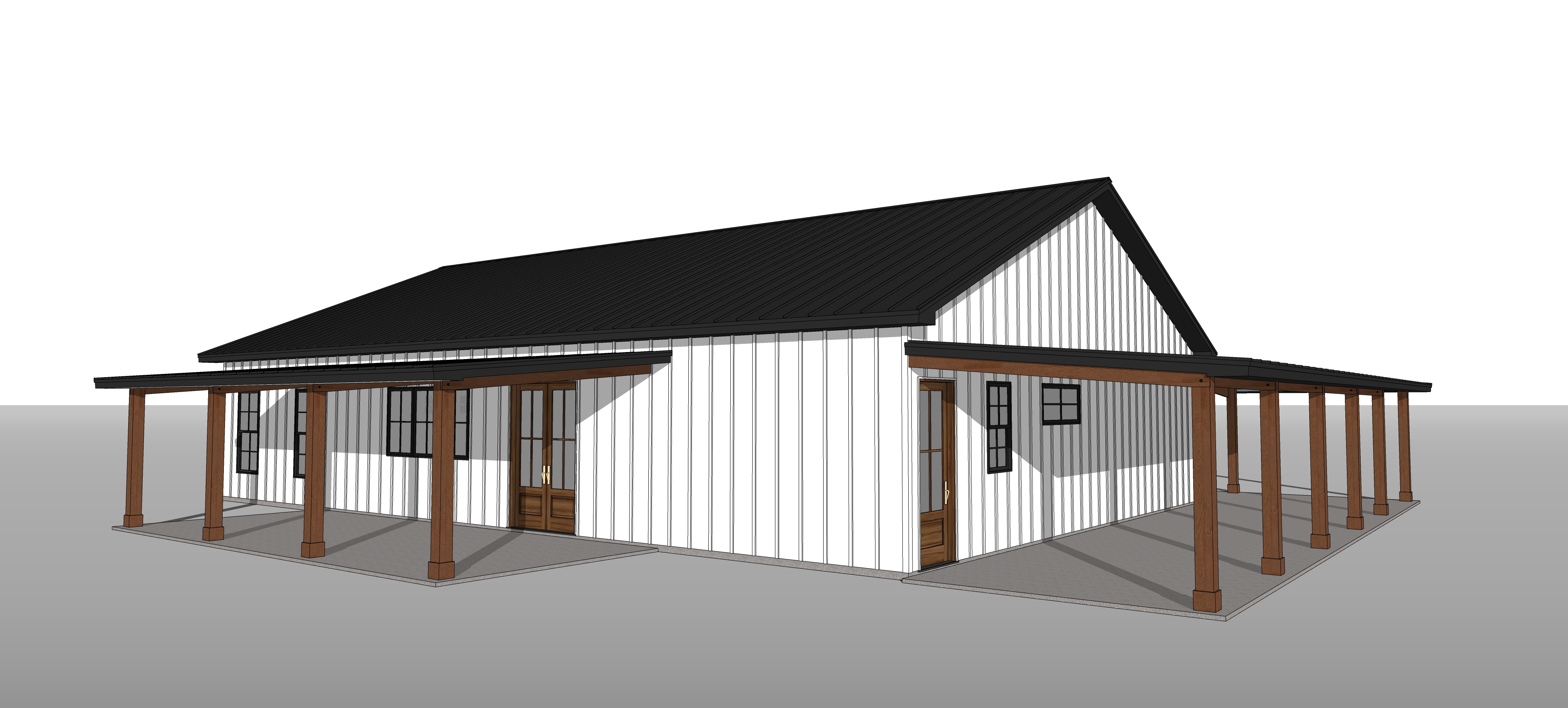 render a modern barn house with a sleek black metal roof and crisp white vertical siding the windows and doors should have dark frames adding contrast to the bright walls the wooden beams and posts should have a rich warm brown tone enhancing the rustic charm set in a tranquil countryside create a sunny atmosphere with soft shadows to highlight the architectural details and add depth to the scene