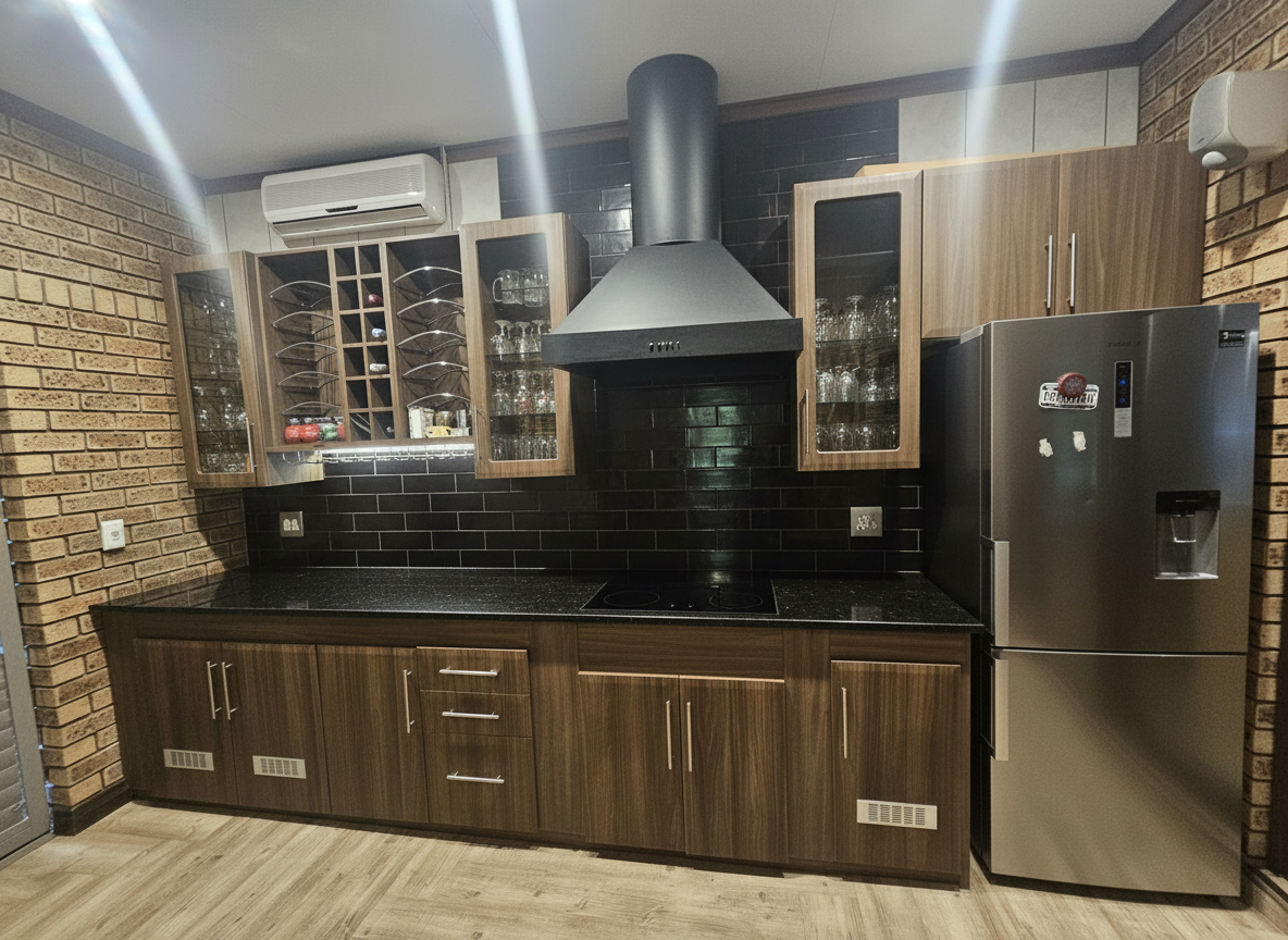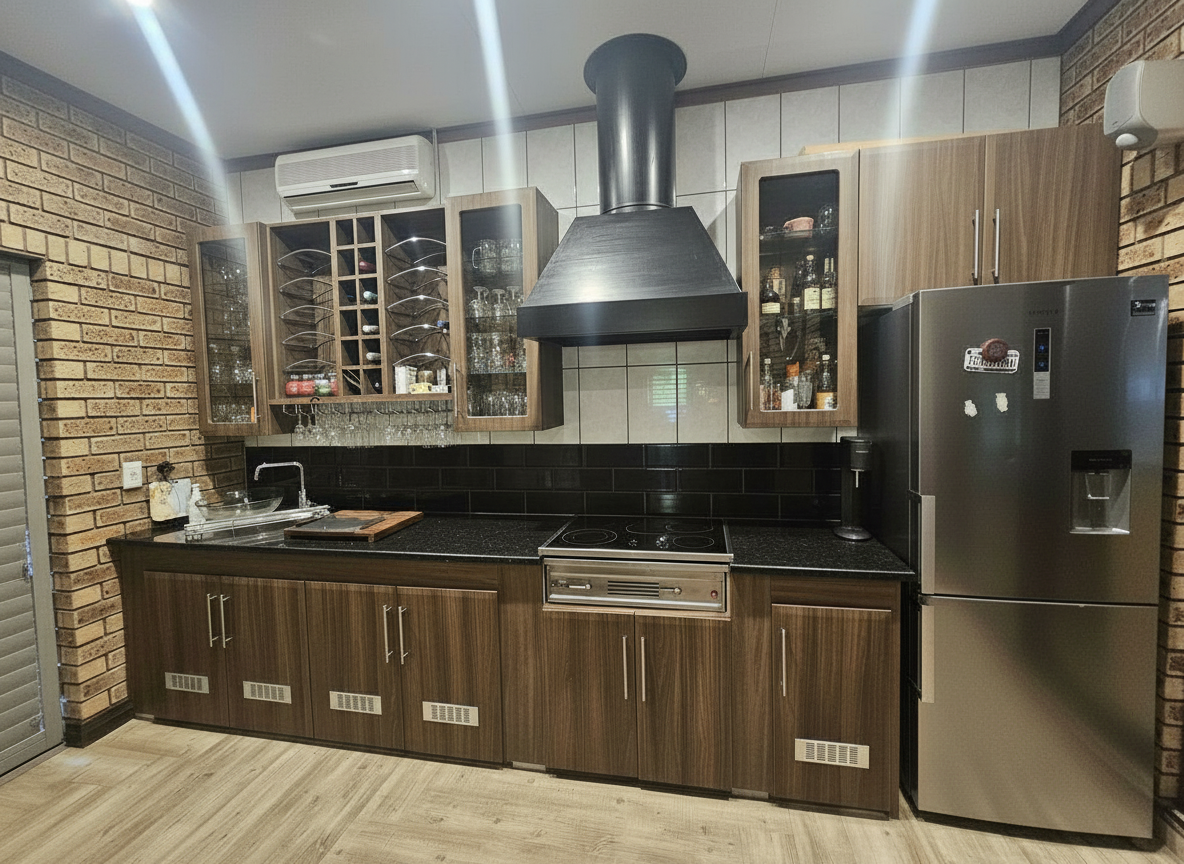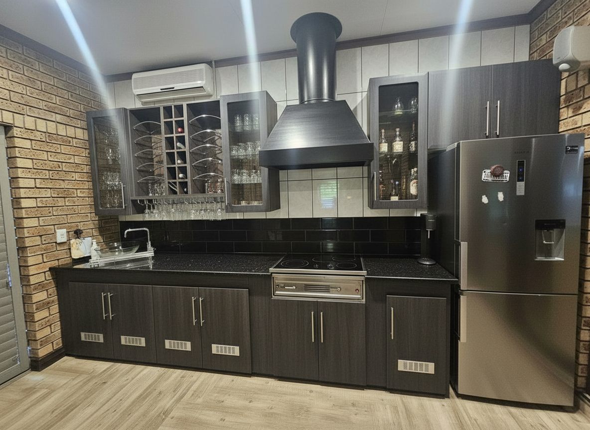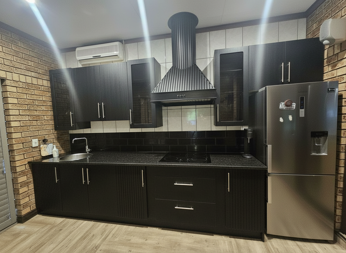 keep floor modernize look of cupboards black sandblasted granite top clad cooker hood white 200x100 tiles on rear wall