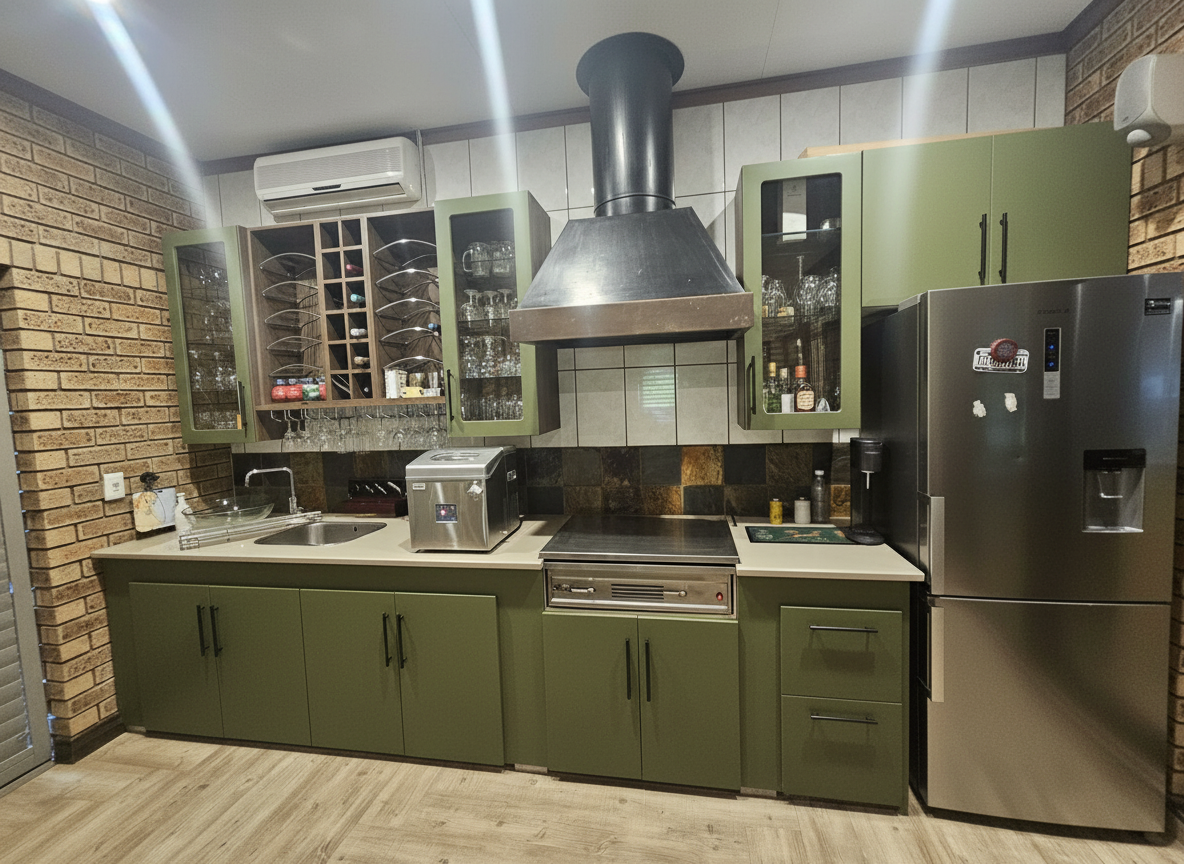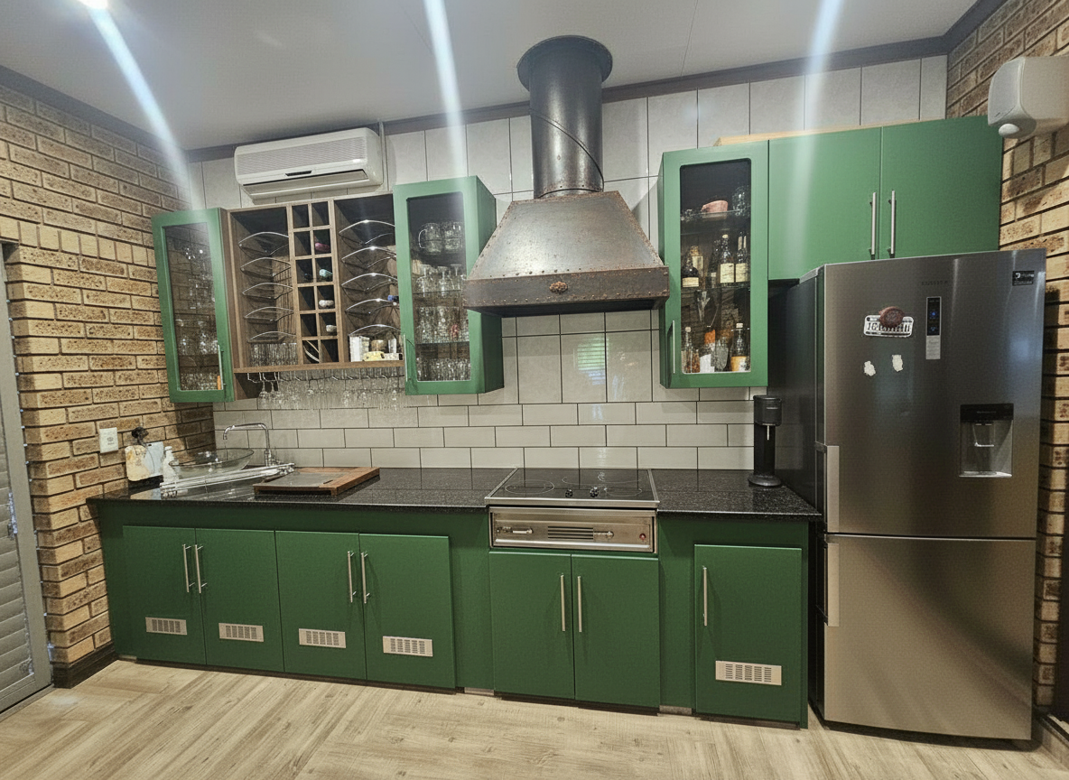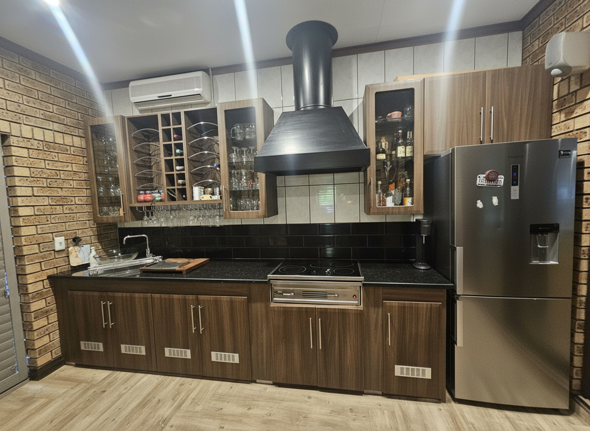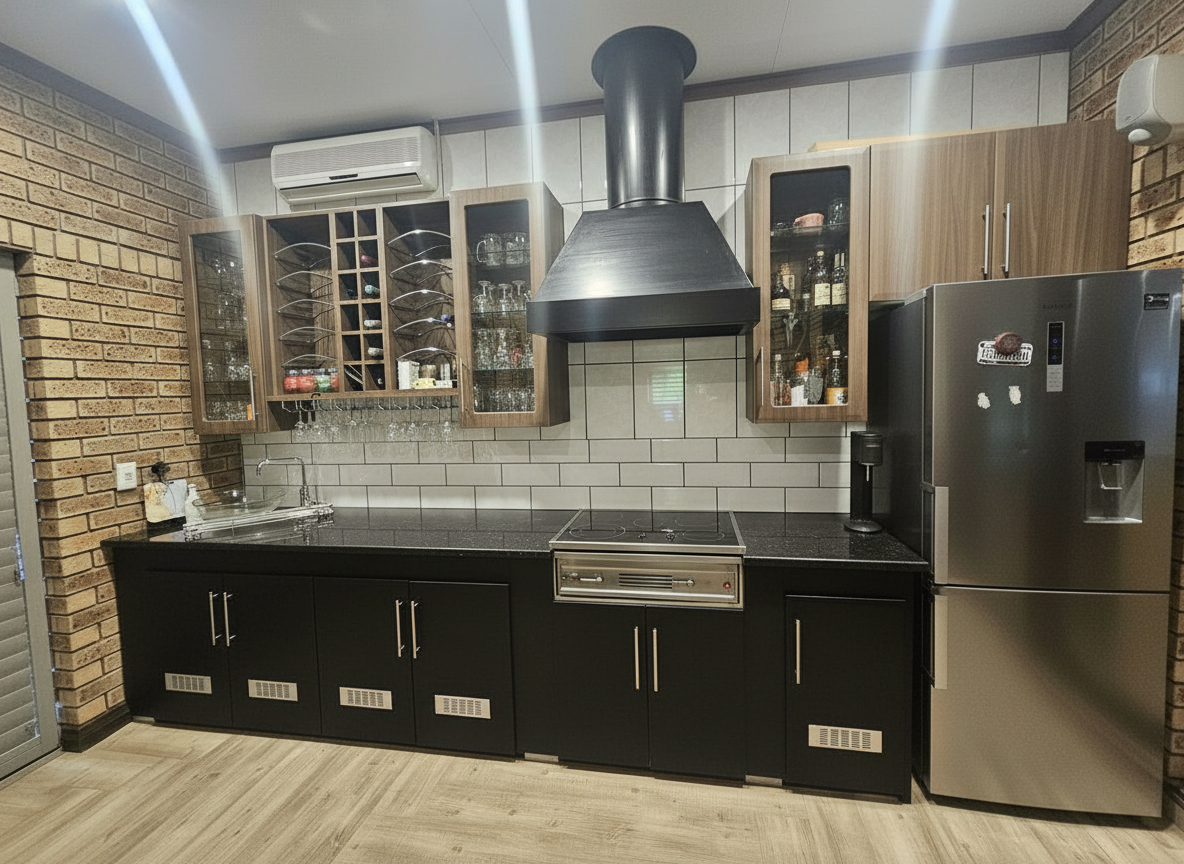 keep floor modernize look of cupboards black sandblasted granite top clad cooker hood white 200x100 tiles on rear wall