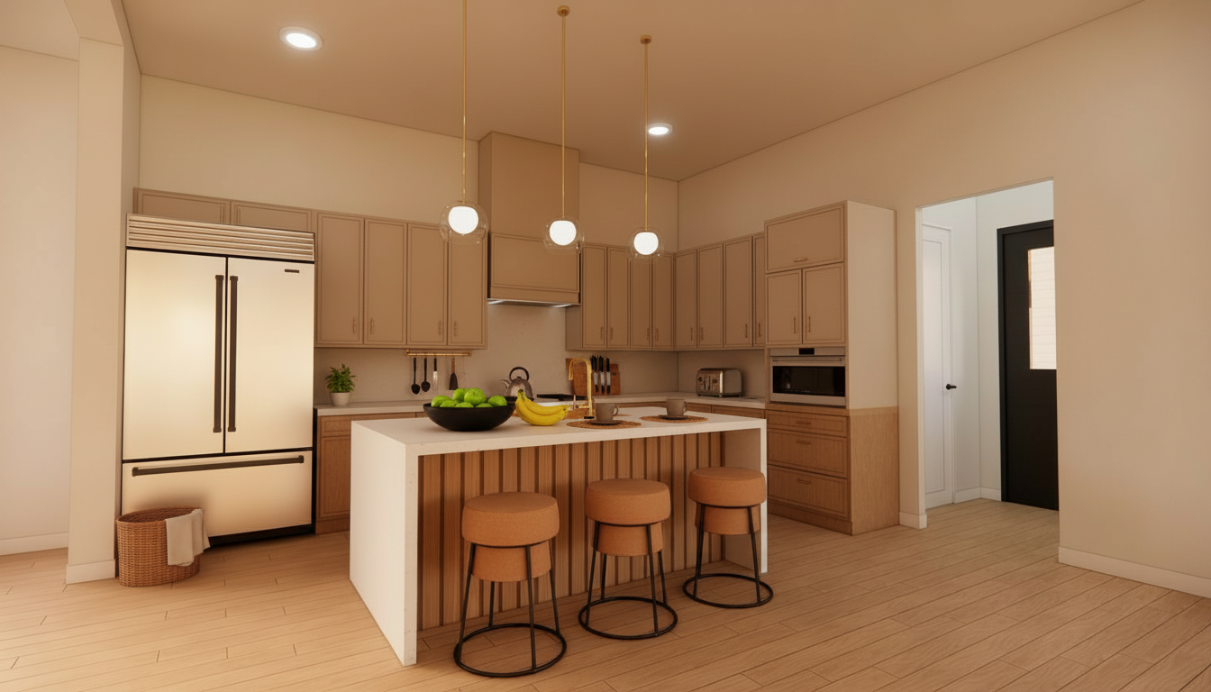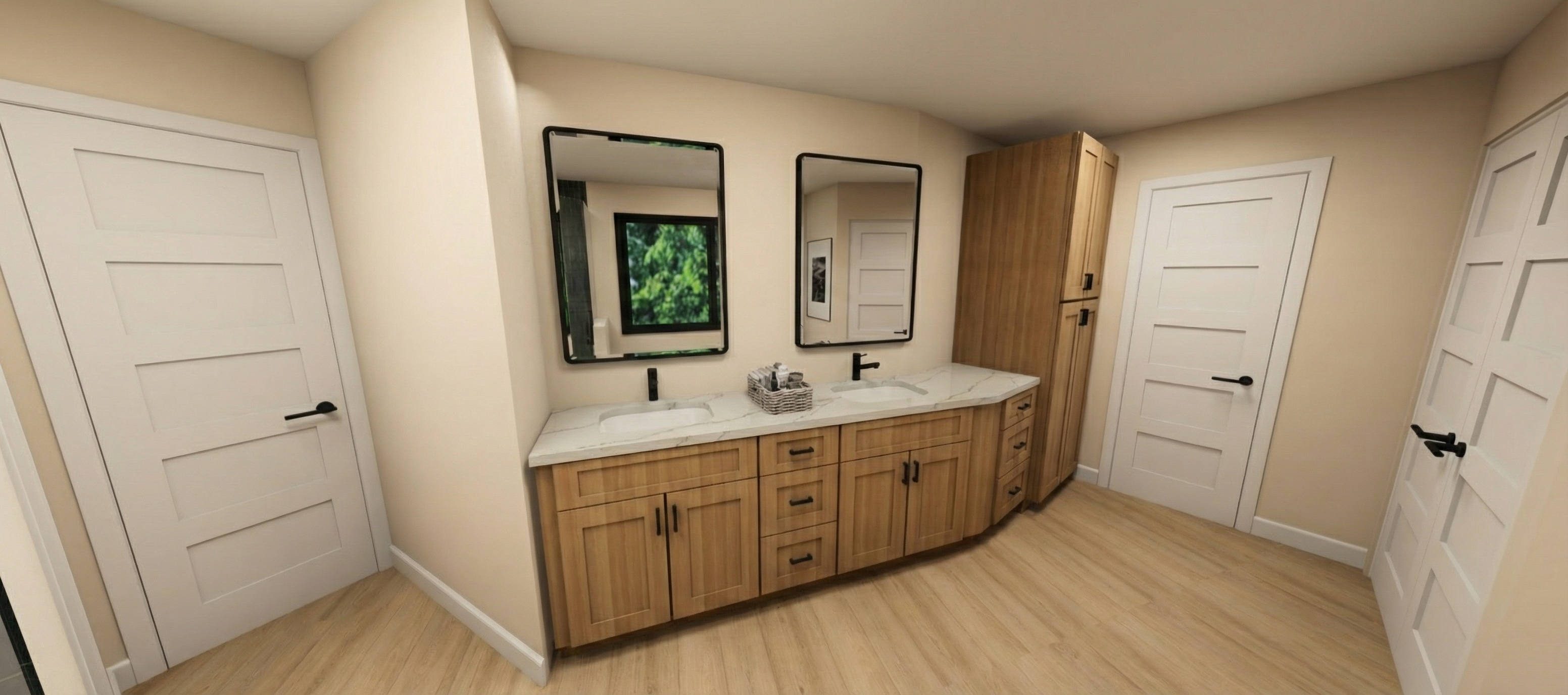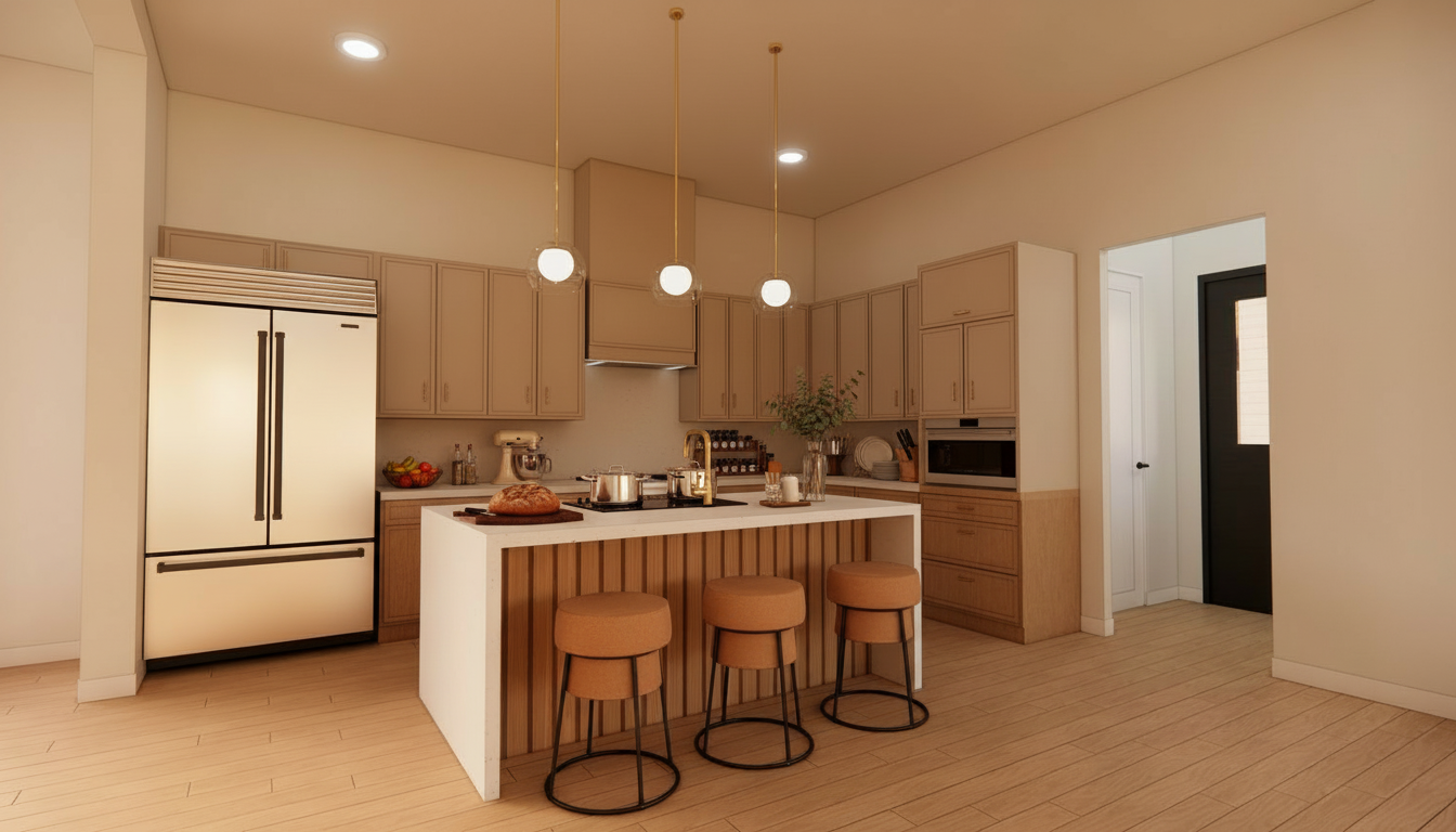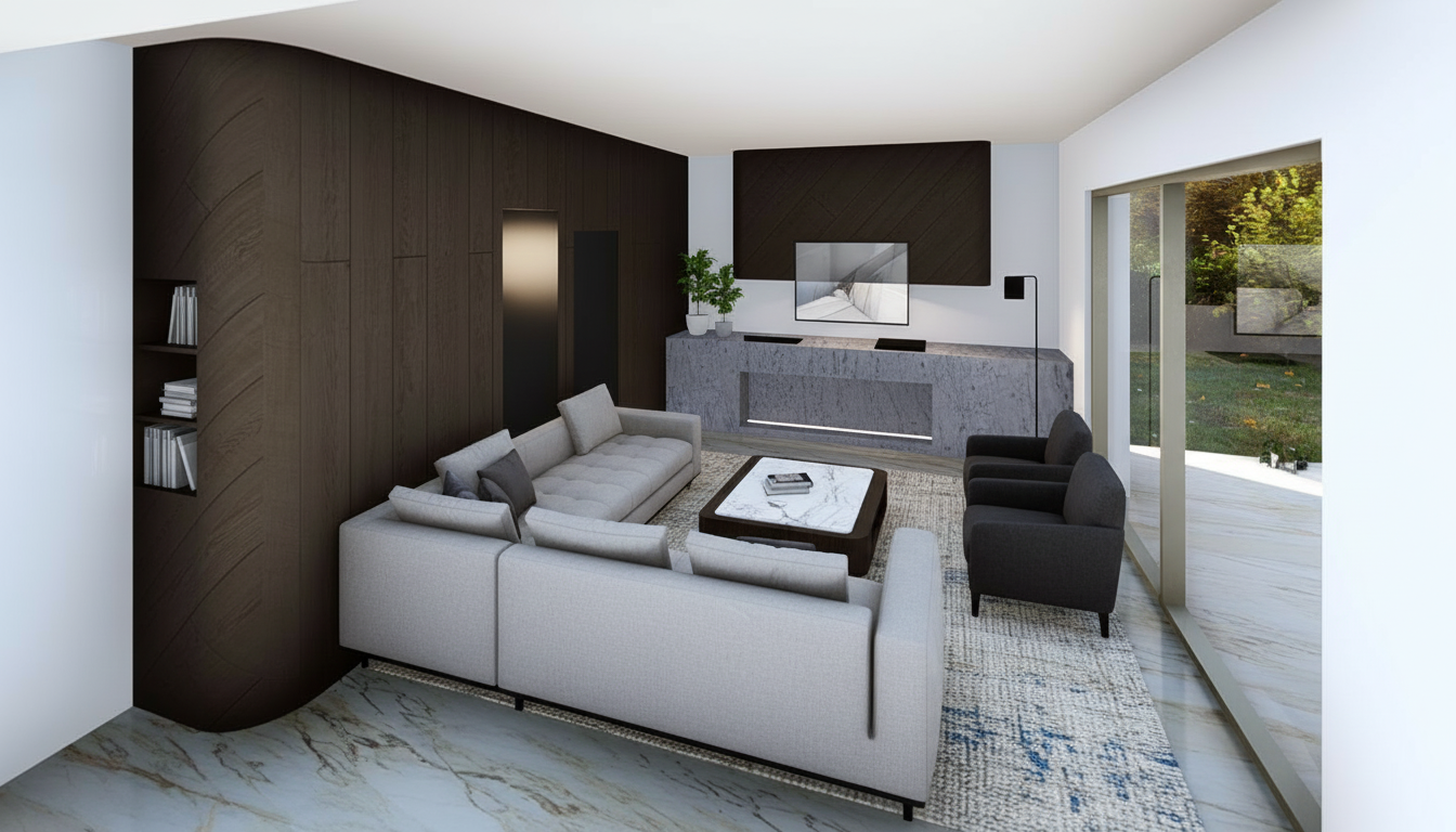 make as photorealistic as possible while keeping textures the same as selection professional landscaping in a lightly wooded scene with good lighting off white stucco dark stone dark roof