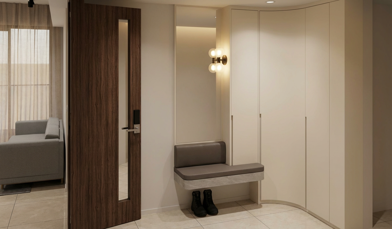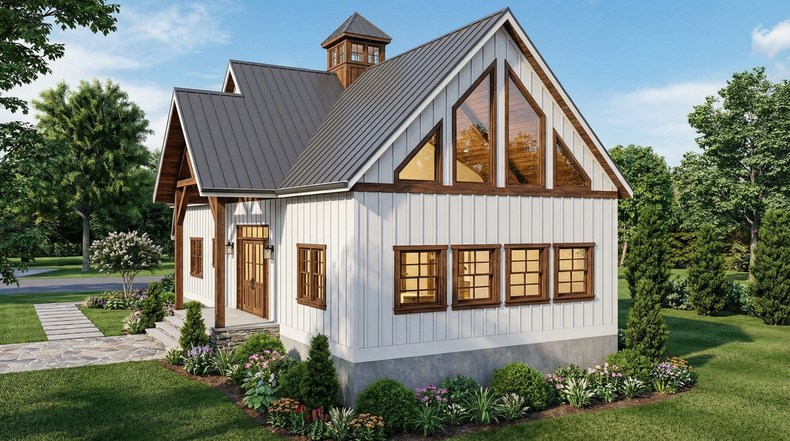 make this rendering into a real photo preserve the material colors patterns scale and dimensions add a small oval fluffy dark red rug in front of the tub add a towel hook in polished nickel to the wall behind the tub and hang a red silk robe on the right side on it make the tub filler in a polished nickel finish the sliding doors should be a in a dark grain wood with raised panel door front add 2 recessed cans where the lights are add one more recessed can in the same size as the others above the shower add some trees and blue sky outside the window and include a sliding window in the window cutout with a black frame add some red and black towels in a botanical pattern to the towel bar on both the top and bottom and have a basket under it and put some used towels in them also that have a patten make the art piece surrounded by a wooden frame
