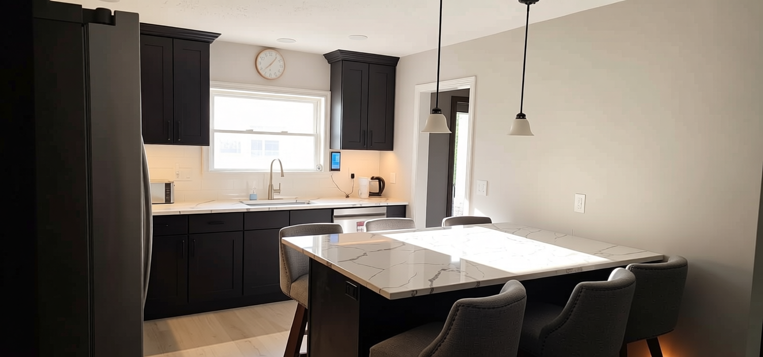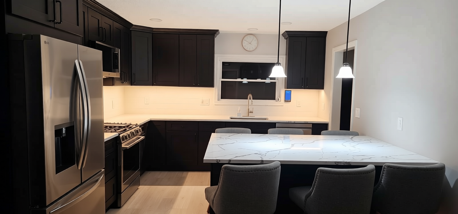 the roof will be black shingles the walls will be clay colored 8 horizontal lap siding black windows and doors and windows will have black shutters there will be a 32 tall stone wainscot with a stone cap on it all along the front porch area garage door will be black raised panel with 1 row of glass in the top panel on all four porch post put a stone pillar base to match reference photo with black wood column on top the small wall area above the porch posts will need to be black show this image with a night scene and exterior soffit lighting