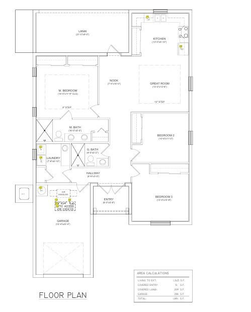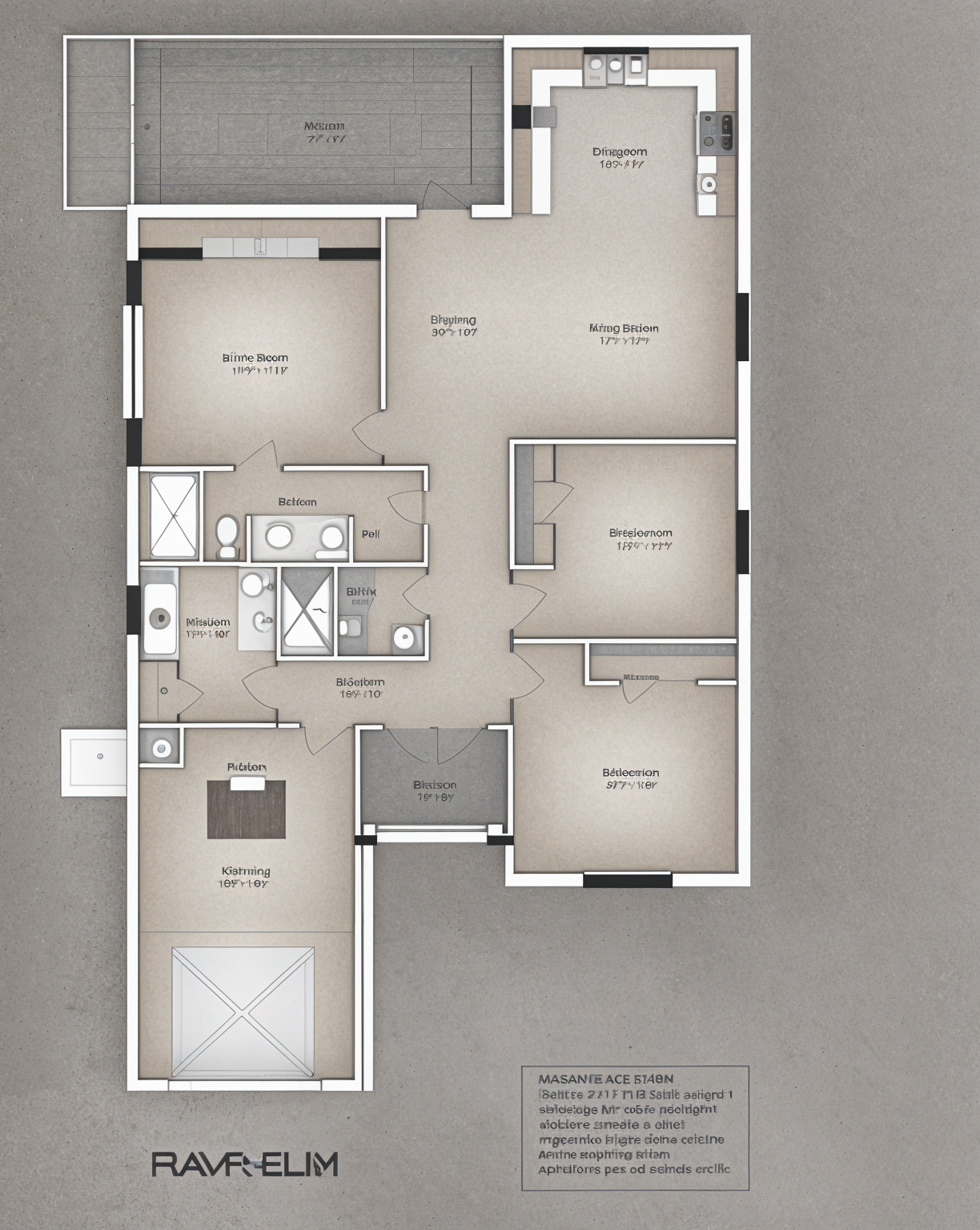take this black and white architectural floorplan and apply realistic interior finishes while keeping the layout symbols walls doors windows dimensions and all text notes completely unchanged and fully legible apply the following textures exactly as specified light to medium grey lvp flooring throughout great room kitchen nook bedrooms hallways entry laundry room tile flooring in all bathrooms master bath and guest bath contrasting tile texture inside the shower areas in both bathrooms lanai should have a clean textured concrete surface garage should remain unfinished bare concrete important instructions all textures must be applied underneath the floorplan linework every wall door swing window symbol label dimension step note and annotation must remain fully visible crisp and unaltered do not delete blur resize or cover any original drawing elements maintain the exact proportions orientation and clarity of the floorplan the final result should look like a professionally rendered floorplan with textures added while preserving the original lines and annotations exactly as is architecture