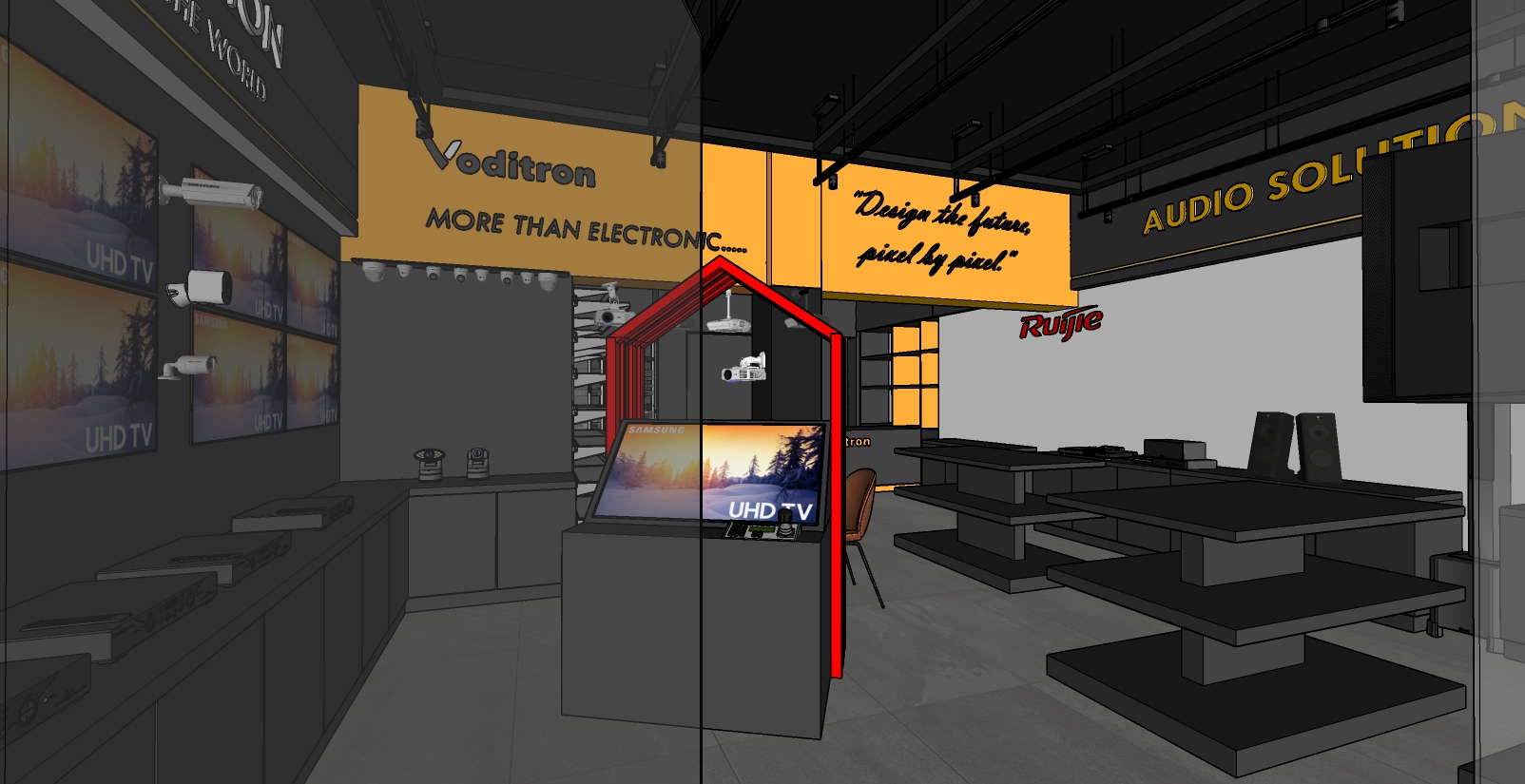electronic shop black wall matarial and yellow