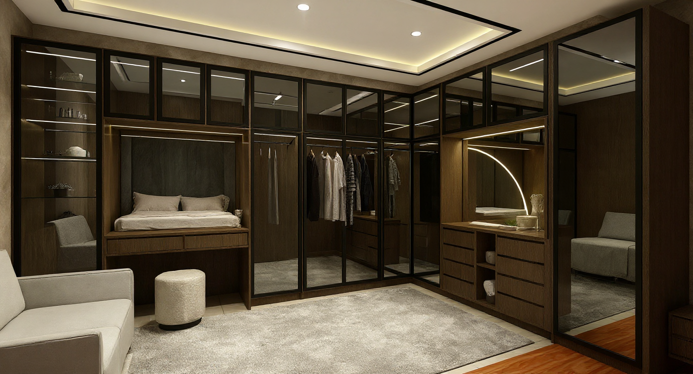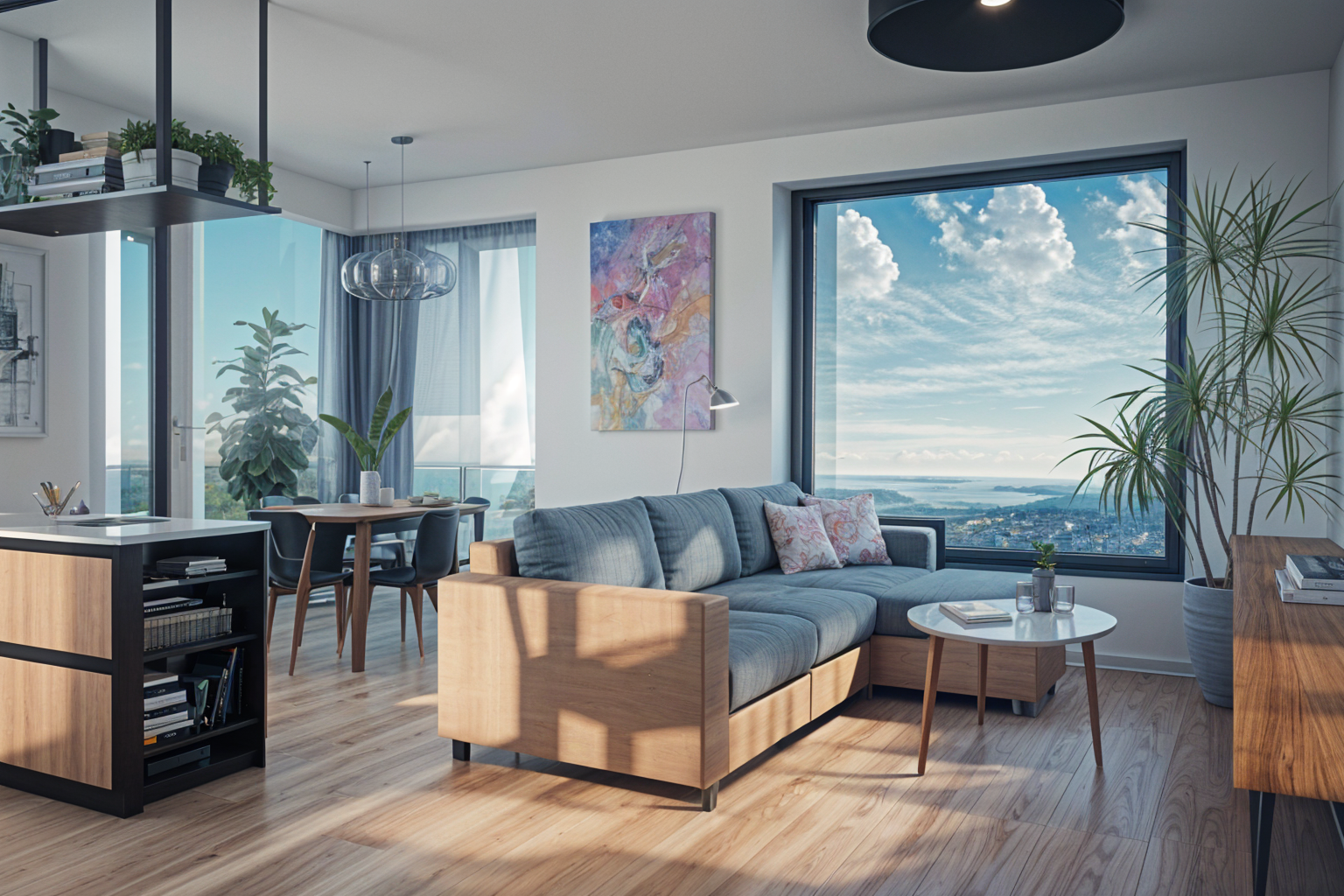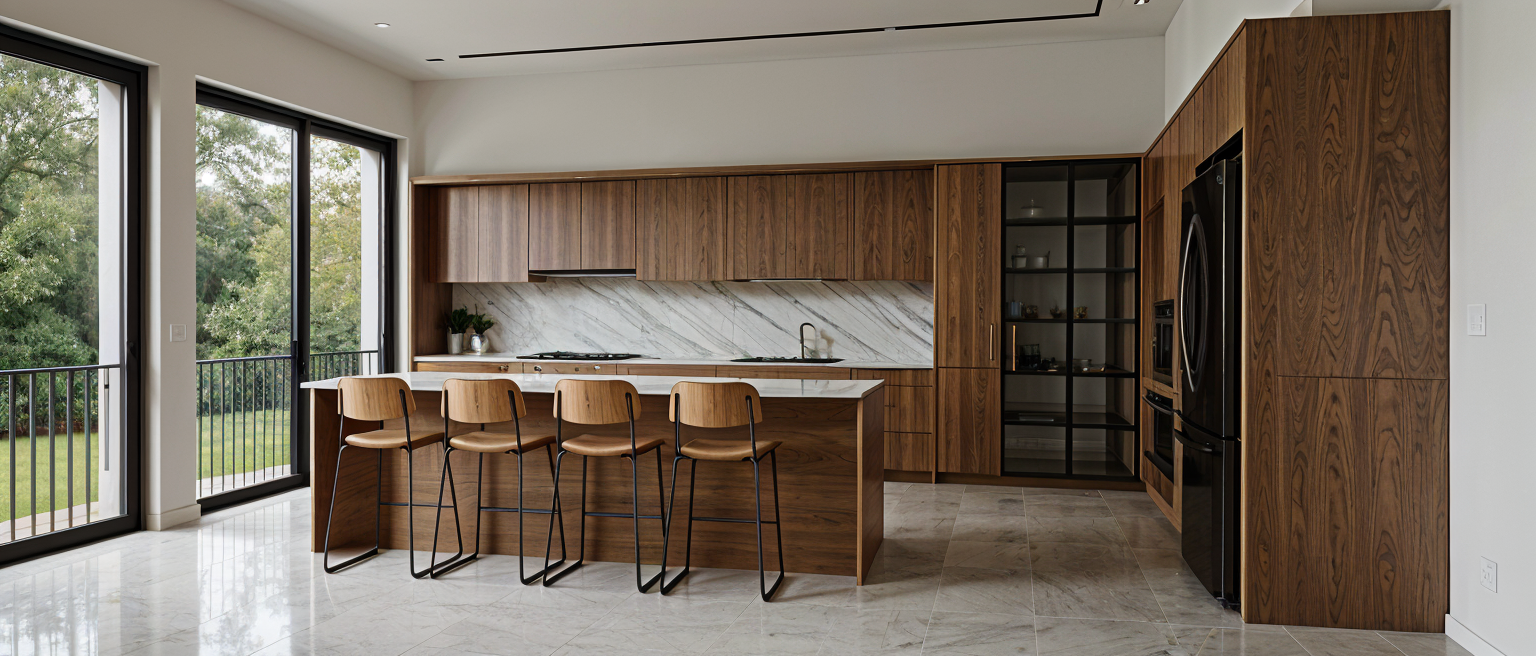 strictly keep everything identical to the original image no redesign no new objects no extra accessories preserve all layouts cabinets accessories and base colors only enhance realism satin smooth clean wood cabinets same color seamless white walls simple modern slightly reflective floor bright soft ceiling light plus natural daylight from left window with green view chair hyper realistic with smooth edges and refined textures final output photo realistic clean modern bright