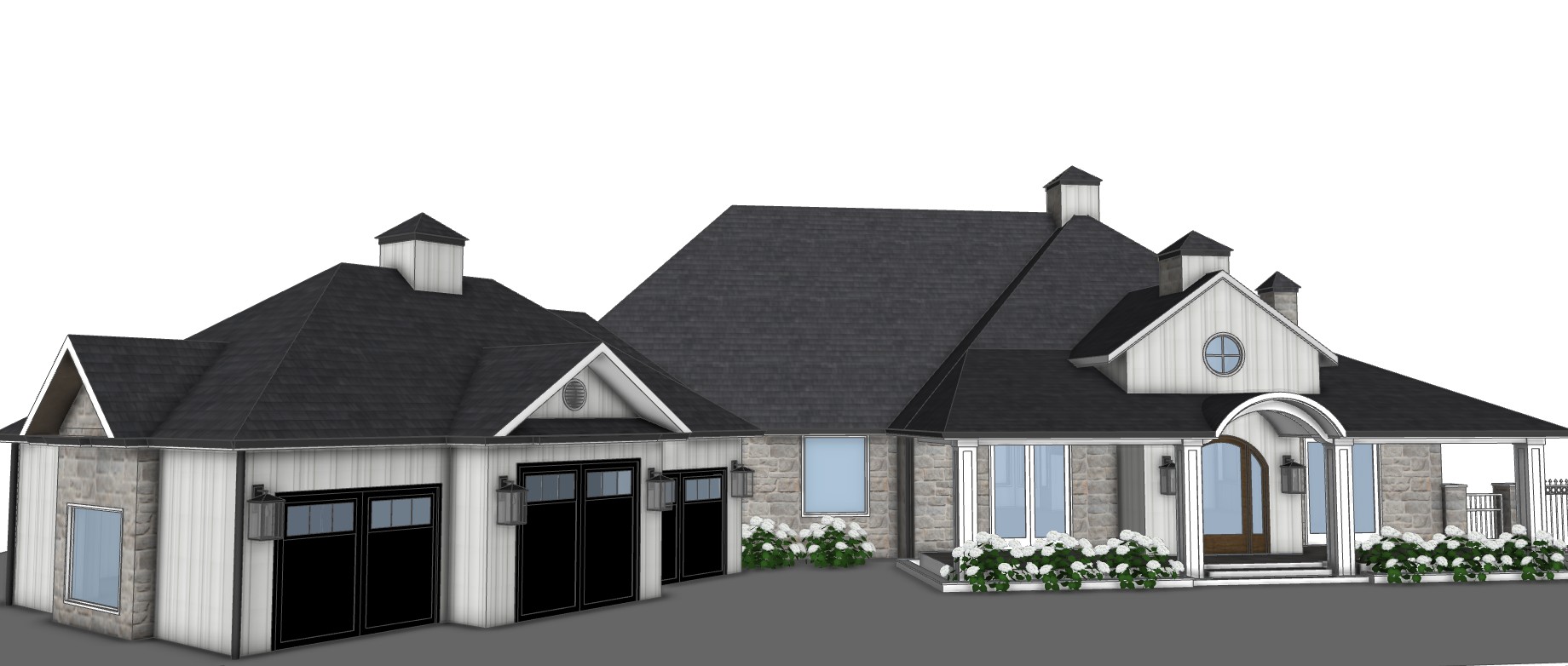 blue sky some pine trees in background warm white board and batten grey stone with overgrout fine pebbled aggregate driveway