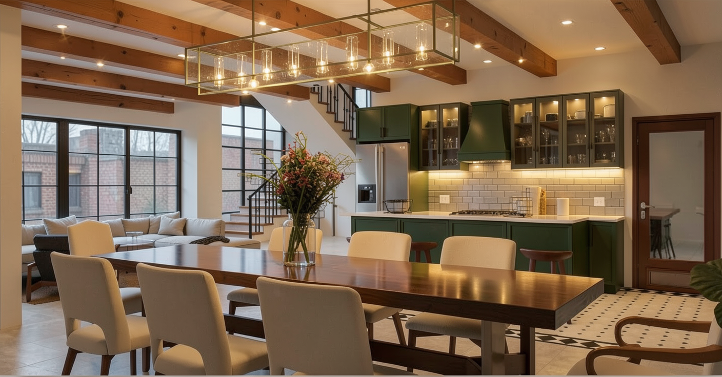 task convert this sketchup model into a hyper photorealistic interior photograph 1 natural artificial lighting primary light source simulate a fully overcast cloudy day natural light must originate from windows but contain zero direct sunlight rays the atmosphere must remain bright airy and high key active fixtures turn on all light fixtures lamps pendants wall lights that are visible in the model they should emit a realistic warm white glow no imaginary lights do not add any artificial light sources like spotlights hidden leds or ambient glows where no fixtures are present in the model do not take initiative to brighten the scene with non existent light sources shadows maintain extremely soft and diffused shadows ambient occlusion only no hard or dark shadows exposure ensure a balanced exposure where the interior is bright and views outside windows are visible and not blown out 2 material nuance sheen anti flatness prevent a dull look by applying realistic varying gloss levels floors wood concrete or stone should have a subtle satin or honed sheen cabinetry and millwork fronts should have a delicate silk gloss finish that gently catches both the diffused daylight and the light from the active fixtures ensure textures are high resolution and clearly defined 3 sharpness focus the entire image must be perfectly sharp and in focus from the foreground to the background no depth of field or background blur should be applied 4 visual consistency maintain 100 visual continuity use any previously uploaded images in this chat as the master reference for materials colors wood grains and finishes the space must remain identical across different camera angles