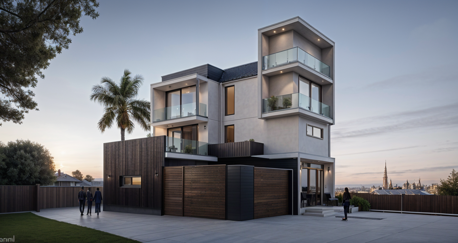 contemporary exterior shot retreat nestled in cozy autumnal forest with spectacular views of snowcapped mountains architecture