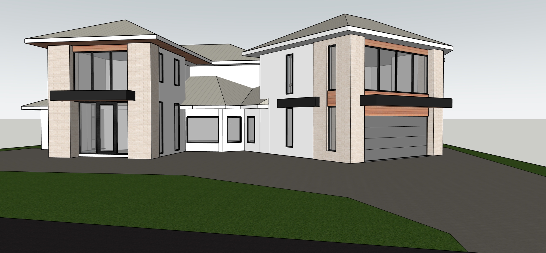render a modern two story house with a sleek contemporary design the walls are off white with light beige stone accents the window frames and horizontal bands are a deep charcoal black the roof is a smooth light grey metal the wooden paneling under the roof line and above windows is a warm rich cedar brown the driveway is brick complementing the lush vibrant green lawn florida landscape set the scene in a serene early morning atmosphere with a soft overcast sky that casts gentle diffused lighting over the house