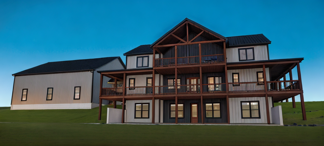 render a picturesque suburban house with a welcoming atmosphere the house features a two car garage with white paneled doors set against a deep navy blue front facade the remaining exterior walls are a soft gray with white trim the roof is a sleek black complementing the modern design lush green grass covers the foreground while colorful shrubs with light pink flowers accentuate the entrance tall leafy green trees form a serene backdrop the ambiance is warm and inviting evoking a sense of tranquil suburban living