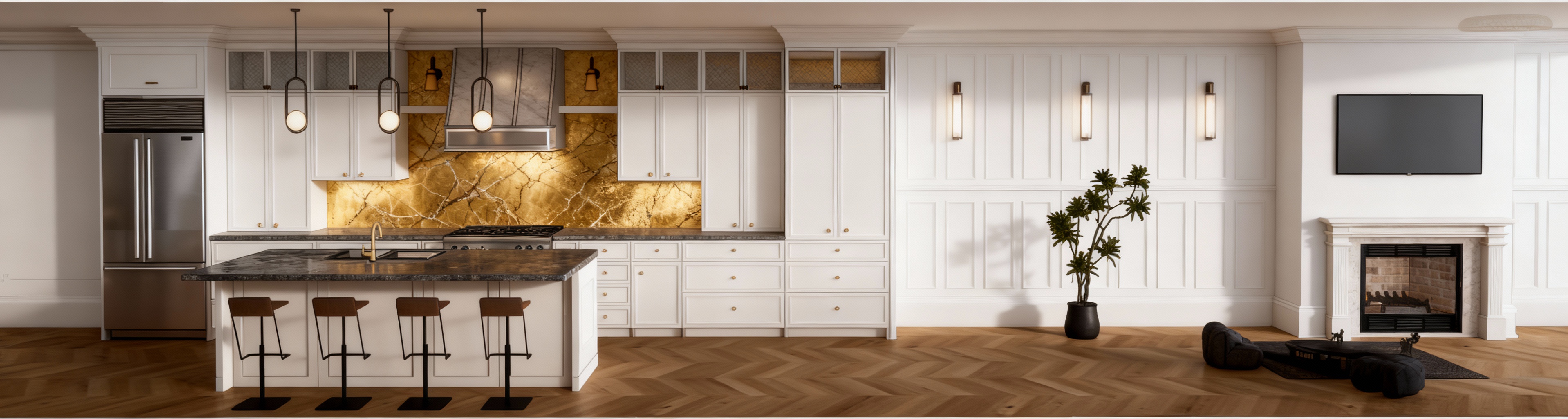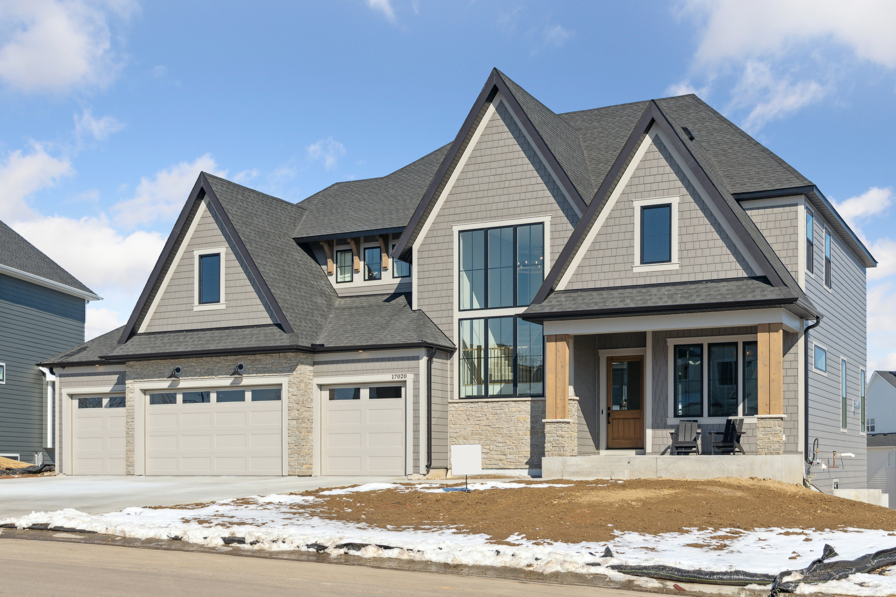 create a high end photorealistic 3d exterior architectural rendering based on the provided reference image maintaining the same architectural style proportions materials and evening lakefront setting with the following design modifications applied precisely massing changes pull the entire garage volume forward 20 feet so it clearly projects in front of the main house massing and the front porch keep the remainder of the house main living mass and porch set back relative to the garage projection maintain realistic roof transitions eave alignments wall offsets and structural logic after shifting the garage forward exterior materials remove all stone from the front facing gables replace stone at gable faces with vertical board and batten siding retain light stone veneer on the lower walls and garage surrounds only architecture materials unchanged unless noted two story modern craftsman transitional luxury home with multiple steep front facing gables warm greige vertical board and batten siding with complementary horizontal siding on secondary walls charcoal or dark bronze standing seam metal roof accents over the garage volume and select lower roof planes taupe architectural shingle roof above black or dark bronze window frames with tall clean proportions warm natural wood garage doors with subtle horizontal detailing and upper glass lites covered front porch with wood posts stone base columns and a warm wood front door site setting smooth light gray poured concrete driveway and sidewalks extending to the forward projected garage finished summer landscaping with lush green lawn ornamental grasses shrubs and small trees in full leaf calm natural lake in the background with soft reflections and distant tree line positioned naturally behind the home lighting mood early evening dusk lighting with a soft blue hour sky warm interior light glow visible through windows subtle exterior lighting at the entry and garage gentle reflections on metal roofing glazing and lake surface camera quality straight on to slightly angled front elevation at eye level accurate scale crisp materials balanced exposure and realistic proportions ultra realistic architectural visualization suitable for client presentation