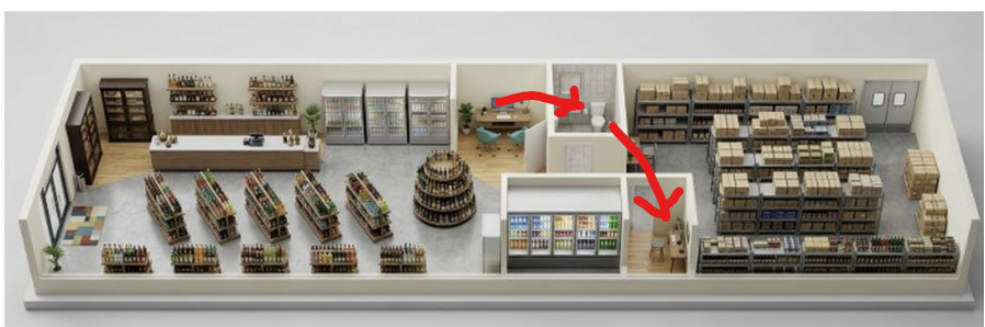 replace large office with more coolers move office to where the bathroom is move bathroom to where the small office is place a desk along the right wall in the stockroom near the exit doors