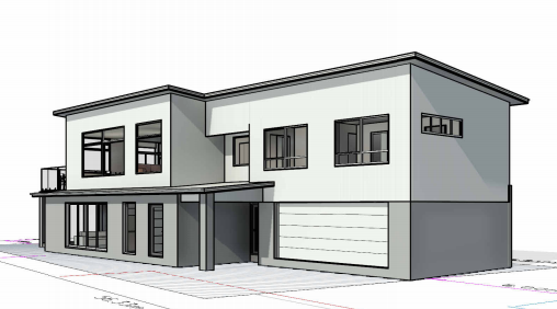 exterior shot modern two story house with clean lines and a minimalist design the exterior features sleek white walls with contrasting dark gray accents on the roof and window frames large windows allow natural light to illuminate the interior the atmosphere is serene and contemporary with a clear blue sky above and a neatly landscaped foreground featuring lush green grass and decorative stones there s a welcoming pathway leading to the entrance lined with small shrubs the lighting is warm creating a cozy and inviting feel
