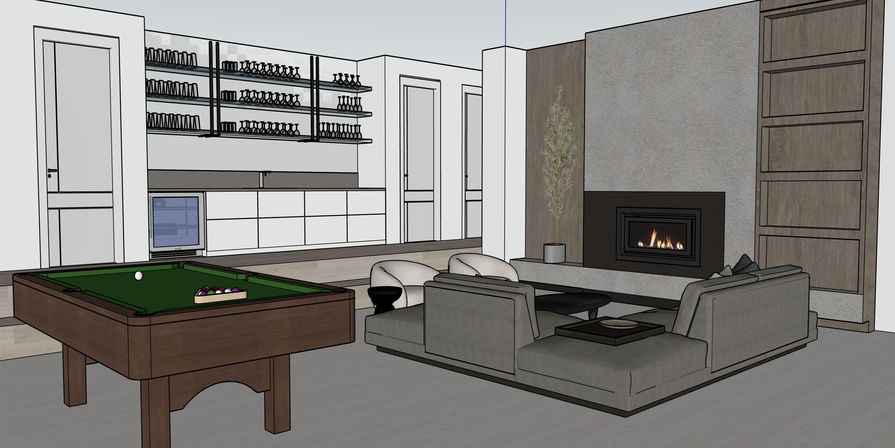 luxury modern contemporary entertainment space modern pool table cool dark wood and cement fireplace shiny white cabinetry on wet bar integrated lighting under bar shelves mirror behind shelves medium wood flooring tile flooring on lower level