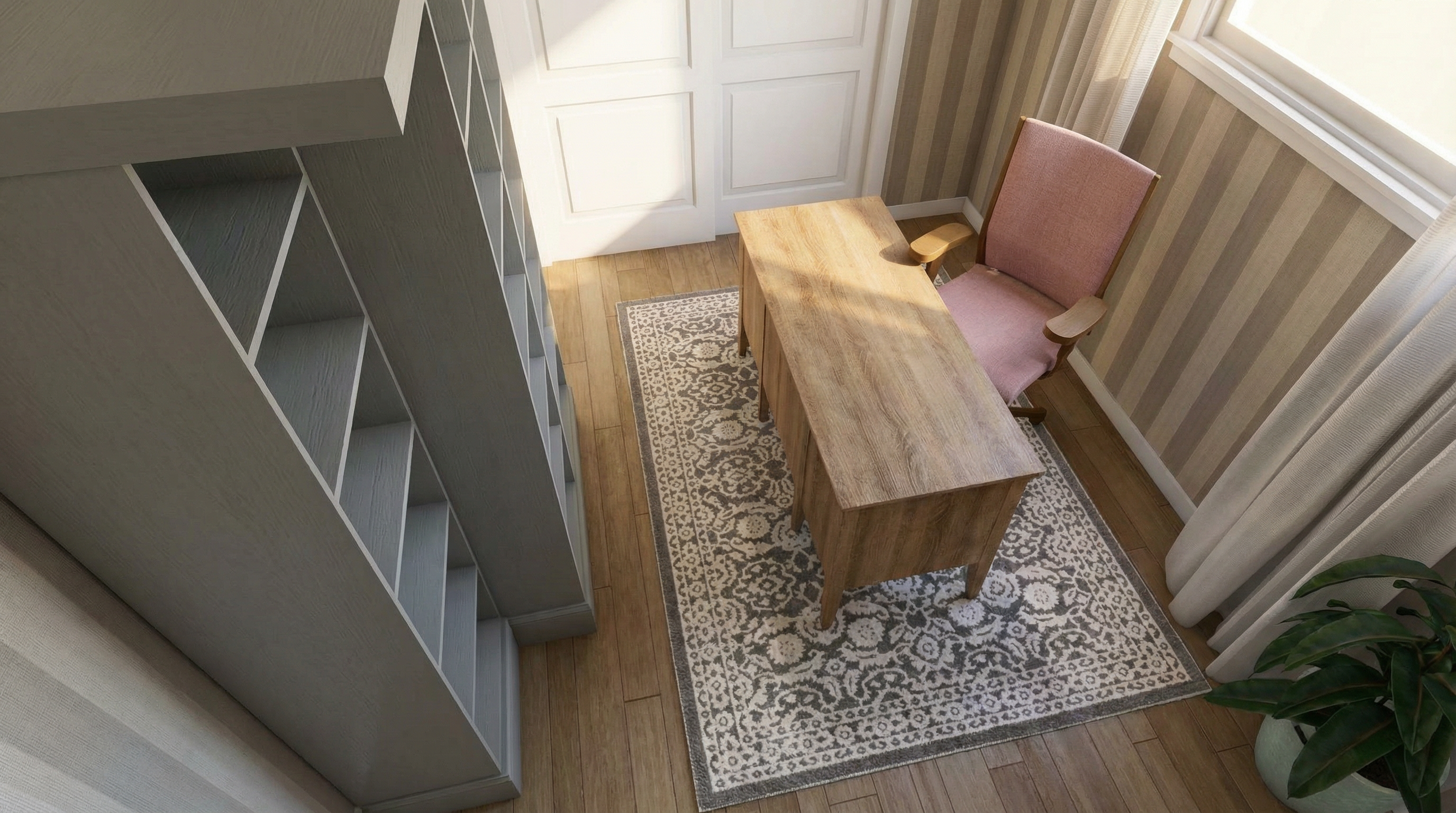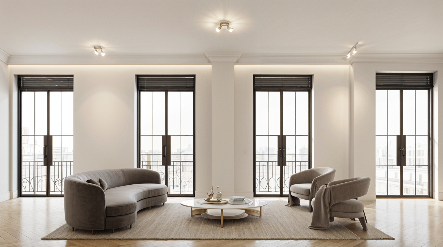 create a highly realistic image of the interior space and maintain the geometry modern elte furniture design soft lighting coming through feature ceiling light pendantswith crown moulding at the top and coffered ceilings