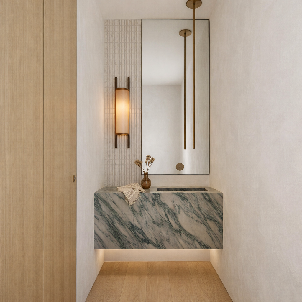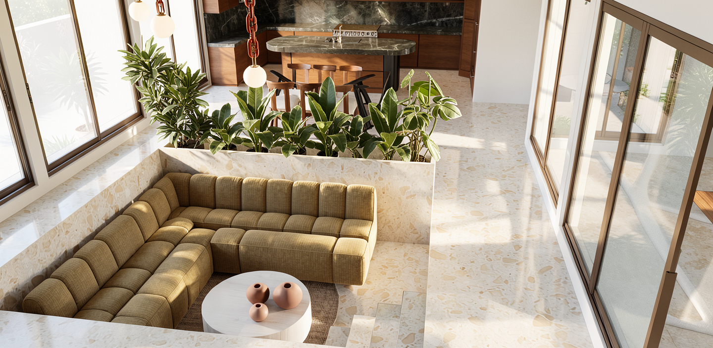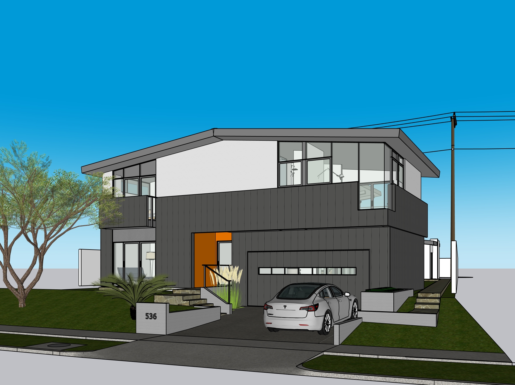 evening view lights on inside the house add california wild grasses and flowers to the landscape add grass in the the yard space enhance the glazing materials add some palms and trees adjacent to the house on the left and right sides of the view add some lights in the planting areas use the perspective view from the source image add a woman walking a golden doodle on the sidewalk add a man and girl waling towards the front entry door add a desert willow tree in the front yard on the left side of the view