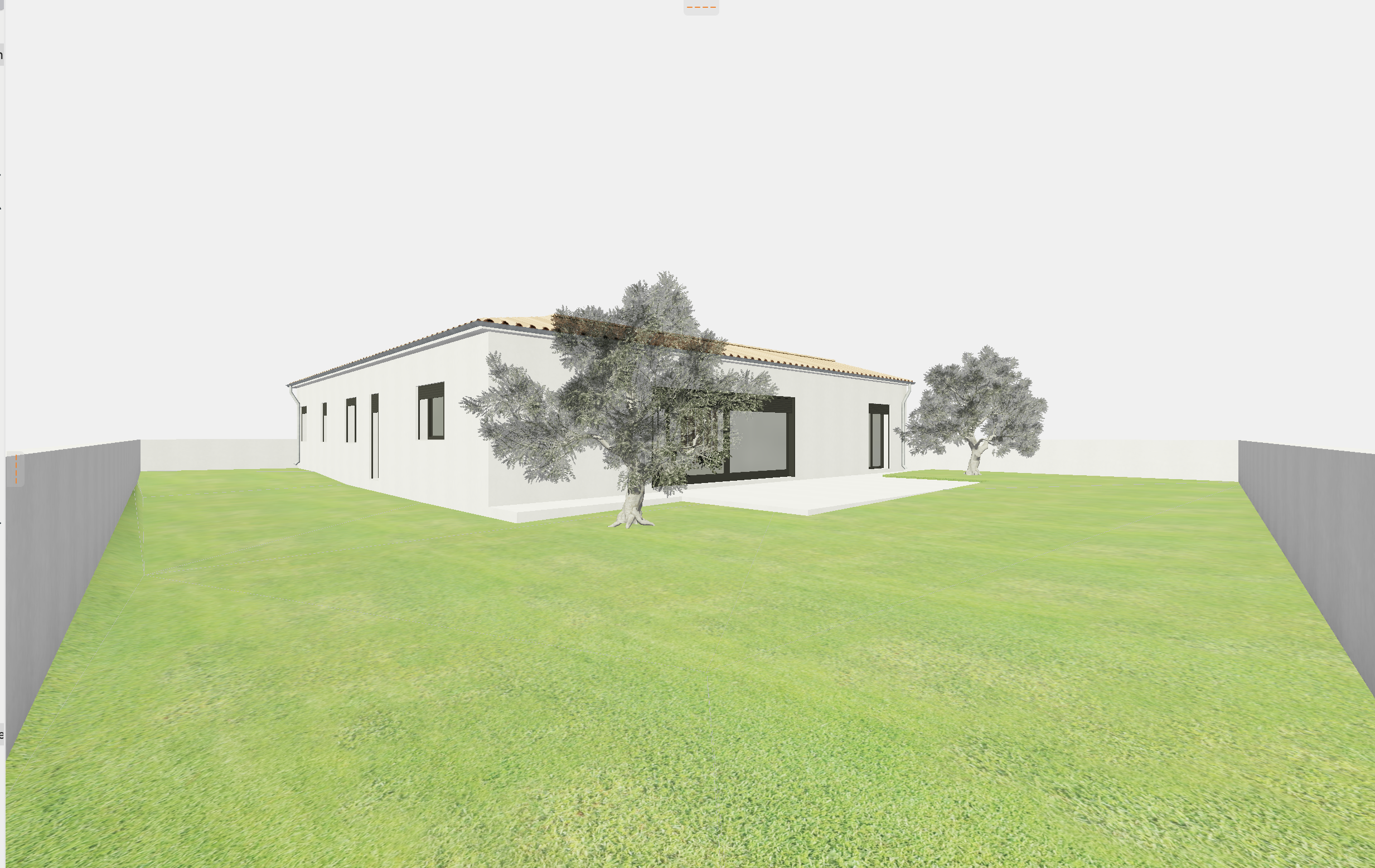 2 olive trees on each side of the terrasse and some mediterranean pine trees in the background add some palm trees and some lavender on the grass the plants are more organised there is a mix of lavender and other mediterranean plants