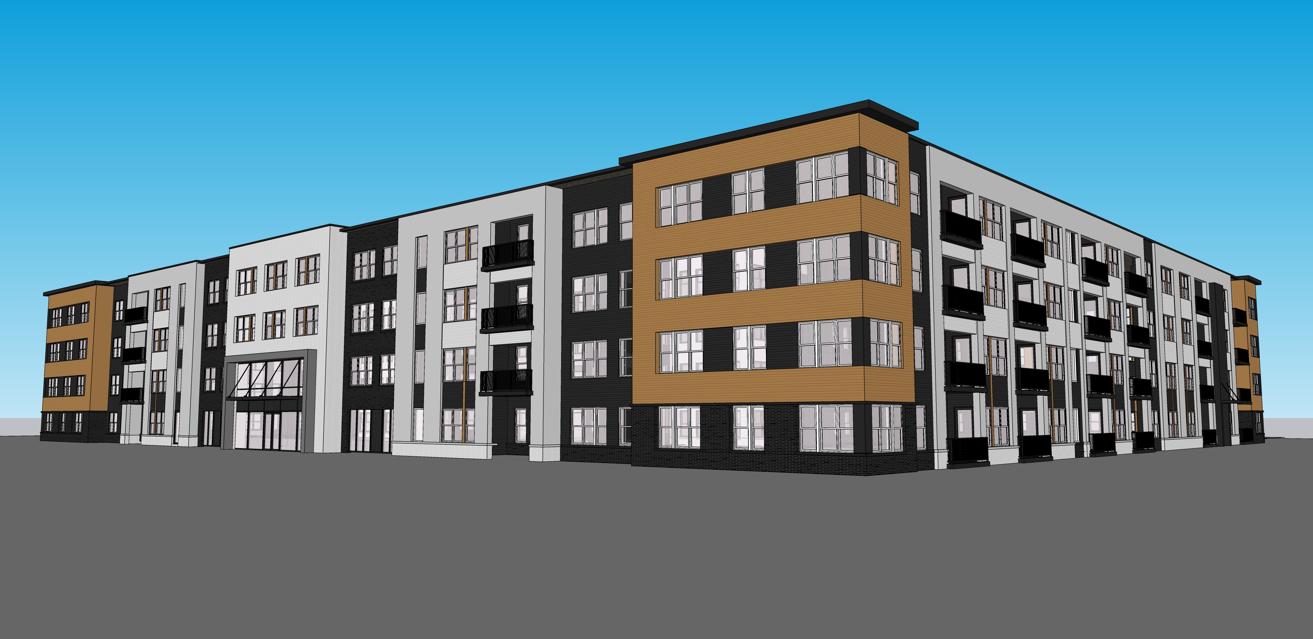 modern exterior shot add landscaping with decorative trees and schrubs at base add trees in background people walking in foreground architecture