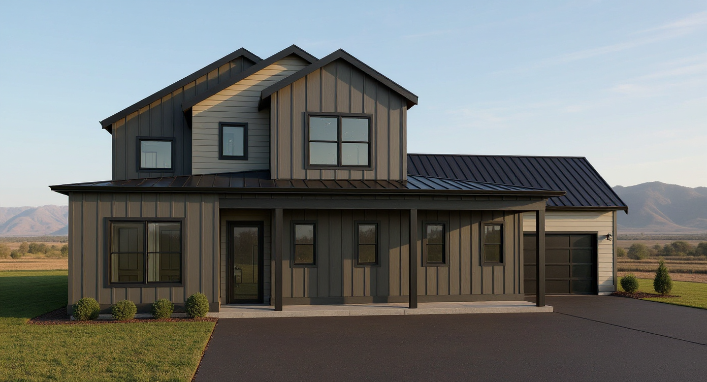 modern house exterior with a minimalist design light gray lap siding dark gray board and batten siding on the main structure charcoal gray asphalt shingle roof large windows with clear glass garage doors in sleek black narrow dark asphalt driveway in front of the garage door serene afternoon light with a clear blue sky casting soft shadow landscaping including large shrubs and neatly trimmed grass for a polished finish low mountains in the background