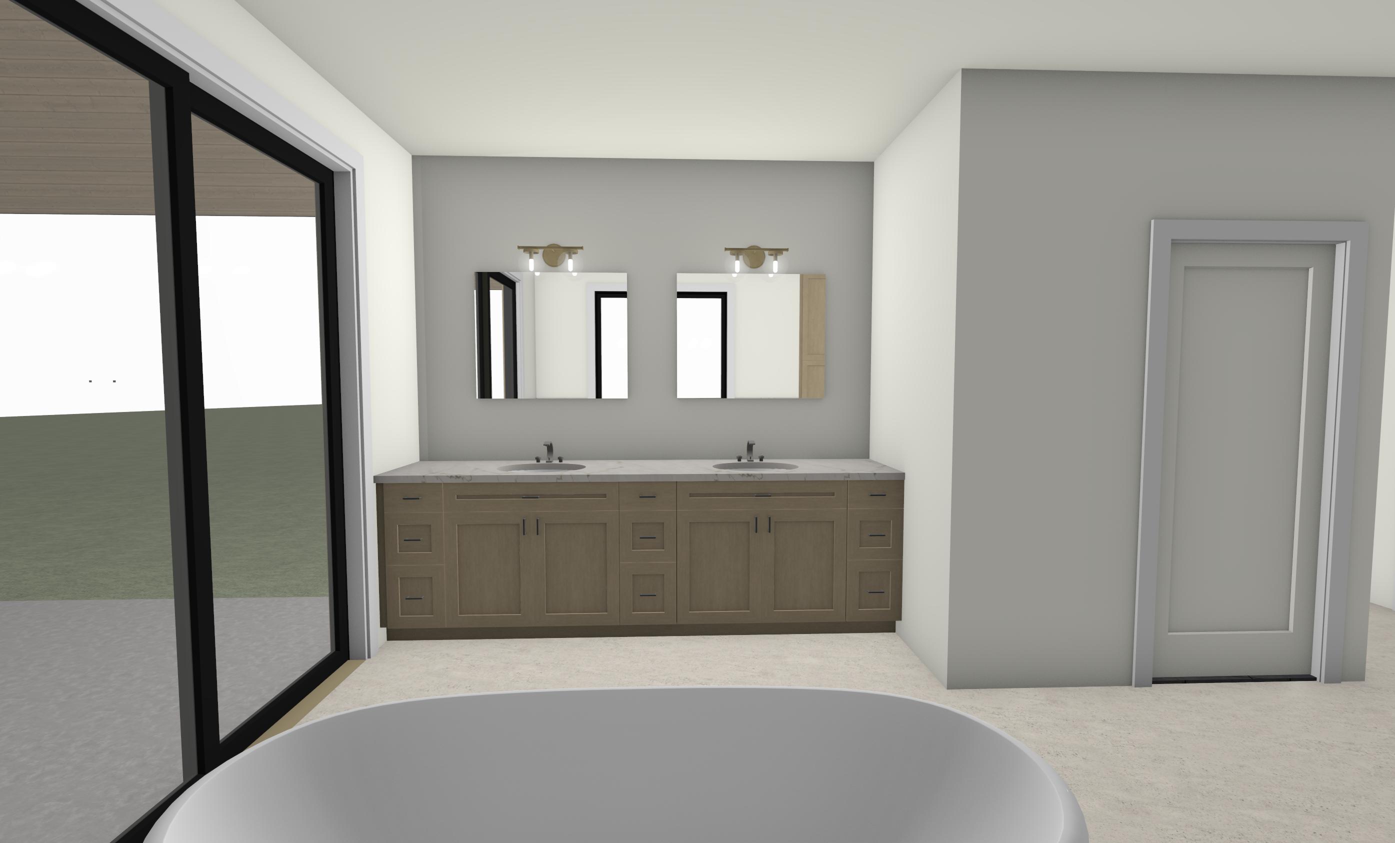 highest priority it s important to keep the sizes of everything the same change textures and materials but keep the sizes of everything the same its important to keep to scale the person in the photo is 5 6 for scale use her for scale and remove her from rendering do not change size of windows or doors do not add doors or windows do not change or add fixtures keep cabinets fridges ovens and all fixtures in the same place and the same size bath room materials warm modern luxury bathroom with light gray marble or quartzite subtle veining polished finish light natural wood cabinetry cabinets flat panel doors minimal hardware soft warm lighting pendant over tub brushed brass accents tall brass faucet neutral color palette creamy whites warm taupes light wood tones wide plank oak flooring clean and minimal styling high end residential design soft ambient glow architectural visualization ultra realistic 8k detail back ground in pine trees and montana vegetation
