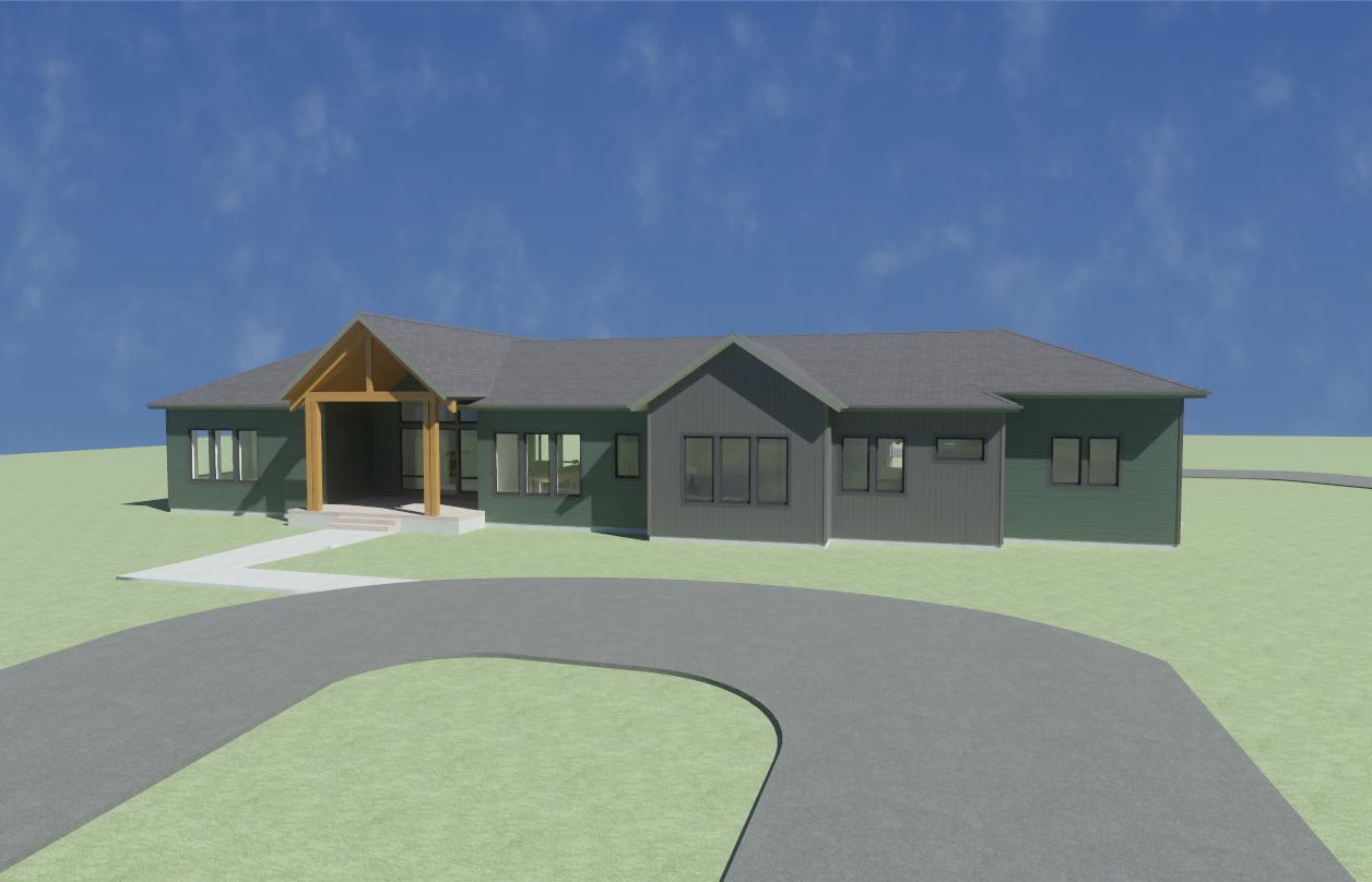 mountain modern single story house with a warm and inviting atmosphere featuring a green and gray exterior the house has a prominent wood framed gable entrance surround it with lush green grass and mix of landscape and hardscape and add a smooth asphalt driveway with concrete sidewalk leading to the entrance the sky is clear and bright blue with misty white clouds enhancing the tranquil and sunny setting set in a field in a valley