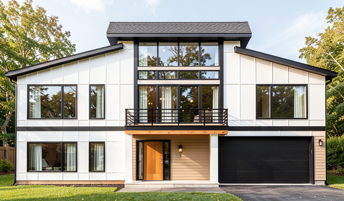 white panel siding black fascia black railing horizontal railing on deck woodtone bellyband lux horizontal siding in fawn next to front door front door to match belly band wood soffit garage door in black roofline to come forward to cover deck