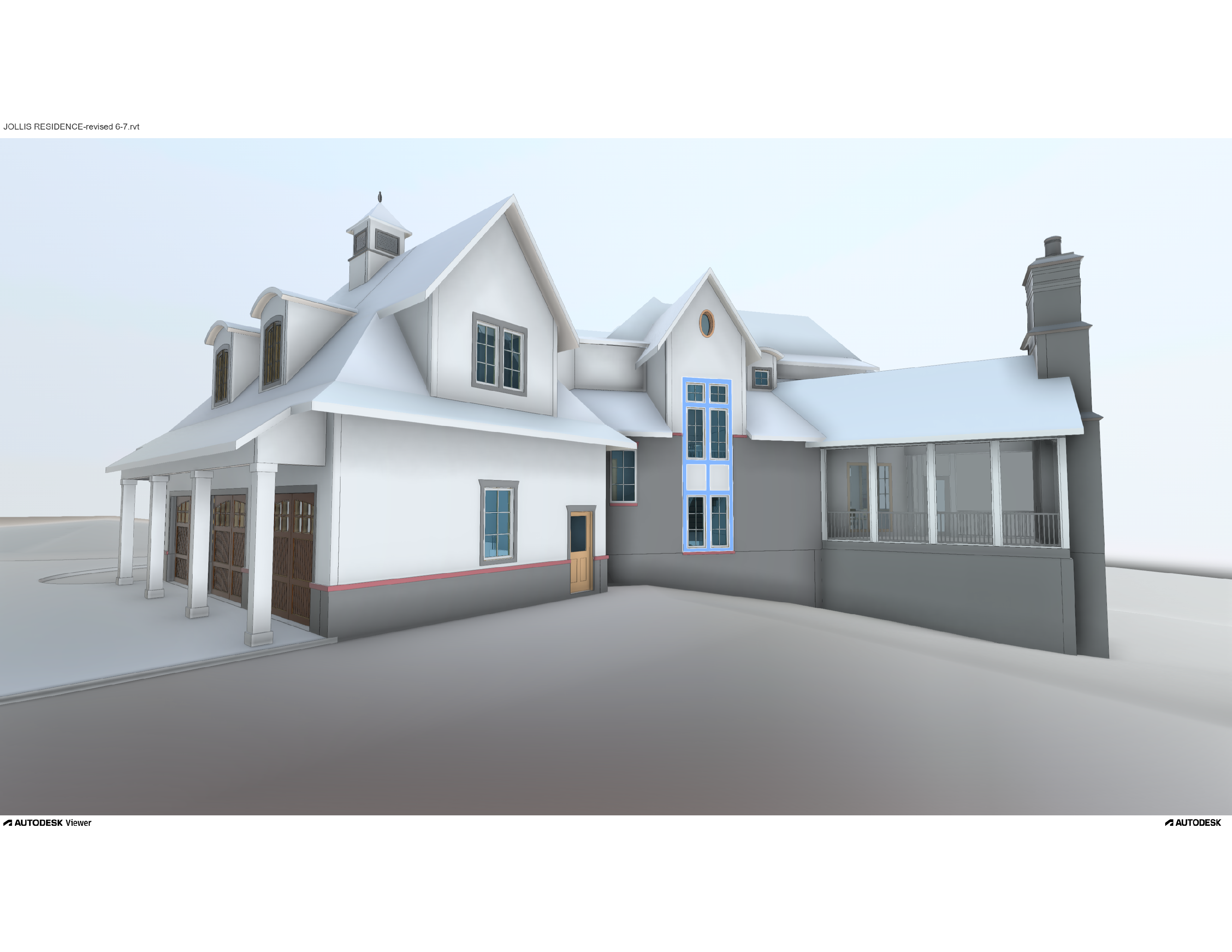 render a charming cozy house in a peaceful neighborhood setting the house exterior features soft gray walls with white trim and a rustic wooden porch the roof is a light gray shingle add natural sunlight casting gentle shadows for a warm atmosphere the windows are reflective suggesting a sunny day the backdrop is a clear blue sky with a hint of fluffy clouds the porch is decorated with potted plants adding splashes of green overall the scene exudes a serene and welcoming vibe make columns stone to match railings will be black horixontal add trees in background