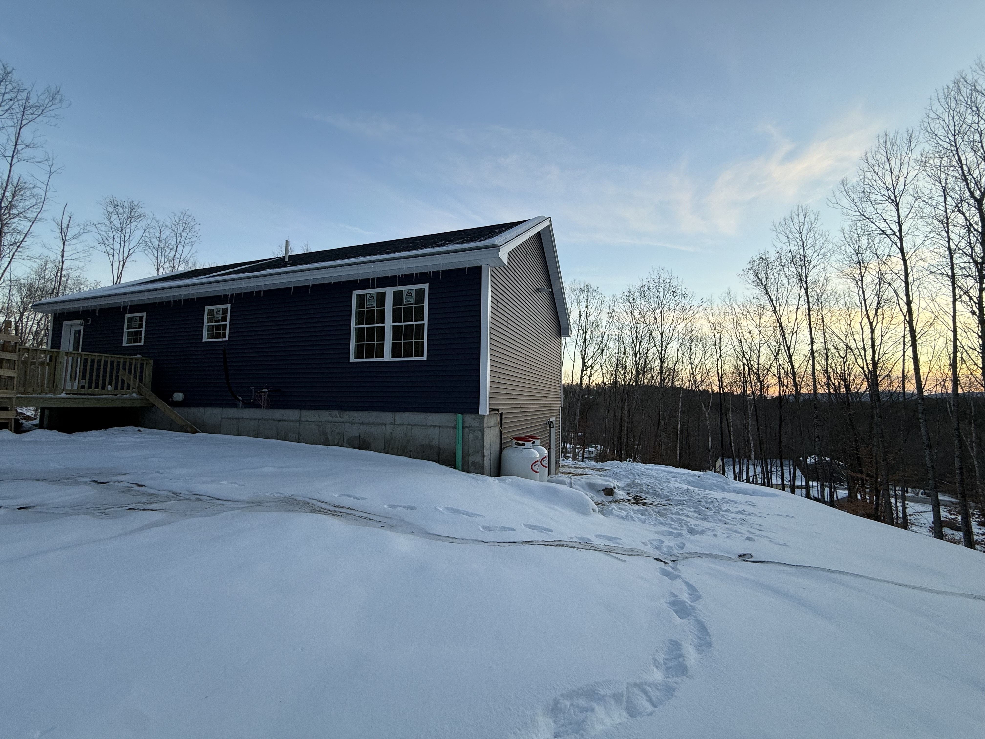 a cozy winter scene featuring a house with deep navy blue siding and white trim the house stands out against the bright snowy landscape the surrounding trees are bare with a serene dusk sky transitioning from a soft blue to warm oranges and yellows as the sun sets the atmosphere is peaceful and tranquil capturing the essence of a quiet winter evening