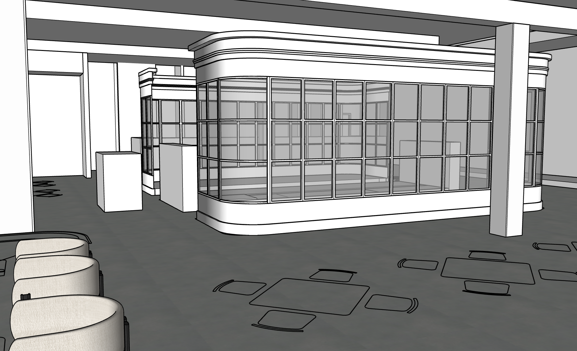exterior shot mo s bagels a new york inspired bagel shop designed as an elegant modern market hall kiosk the space features a glass enclosed corner structure with slim metal framing and softly curved edges a continuous illuminated signage band wraps around the top displaying the name mo s bagels in refined vintage inspired serif typography along with classic menu items like lox schmear pastrami and egg sandwiches the design blends european caf sophistication with new york deli culture materials include deep forest green paneling brushed brass trim white backlit signage and large glass panels creating an open inviting feel interior shows a clean high end bagel preparation counter with stacked fresh bagels warm lighting and subtle industrial touches the atmosphere is polished yet nostalgic an upscale interpretation of a classic nyc bagel shop minimal clutter strong architectural lines curated details and a warm welcoming glow color palette dark green cream black brass accents and soft warm lighting style modern vintage european market hall refined urban kiosk cinematic lighting highly detailed realistic architectural photography