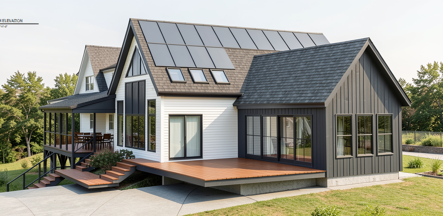make the deck level with the ground bring the trees a bit closer add a flowering rock garden beneath the three windows on the right make the portion that is currently vertical dark gray board and batten into white horizontal siding make the current white part vertical dark gray board and batten