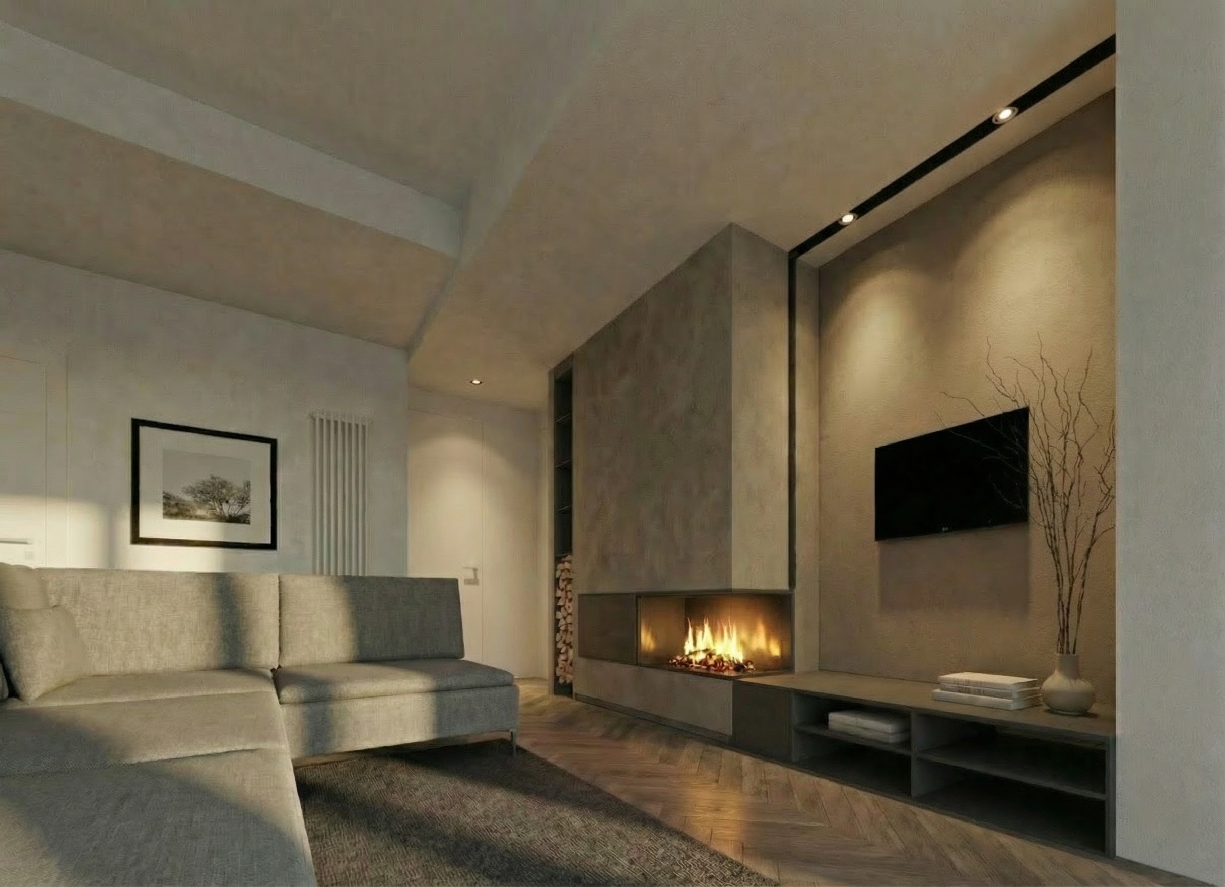 convert to full night scene remove all daylight completely no exterior light entering the room windows dark only artificial lighting active recessed spotlights in the black ceiling groove above tv one recessed spotlight between the doors soft focused spotlights above the artwork fireplace as warm main light source deep night exposure lower overall ambient light warm artificial lighting contrast soft falloff into shadows keep geometry materials and furniture unchanged no redesign no new objects