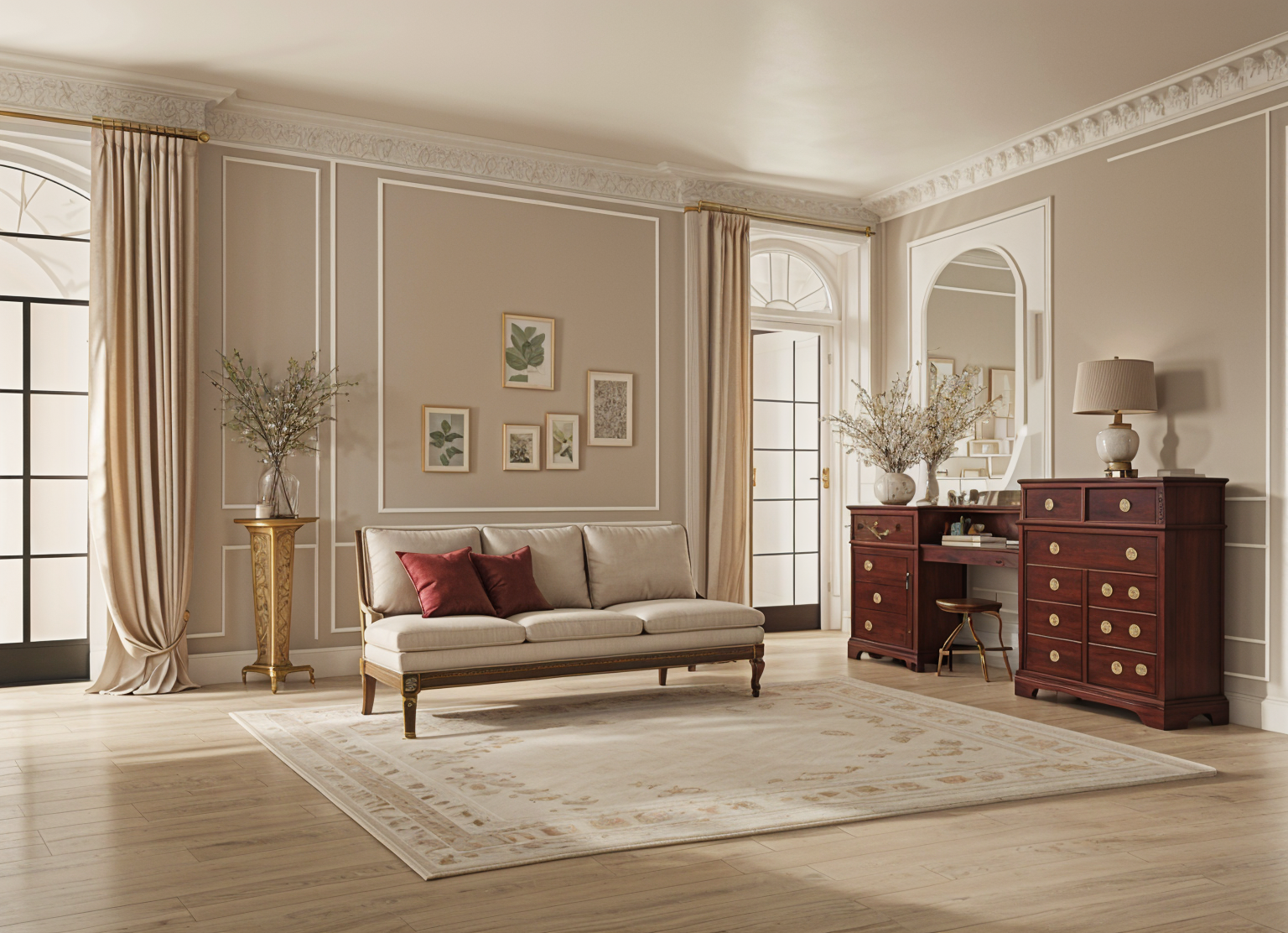 minimalism interior shot transitional style overall color beige with deep red or antique brass as accent change the design of the cabinet to be less japandi wooden floor architecture