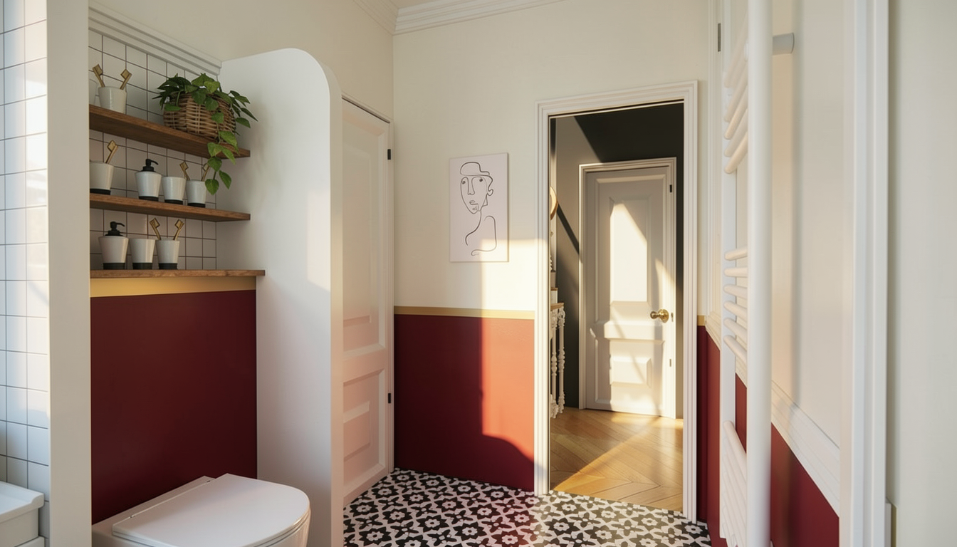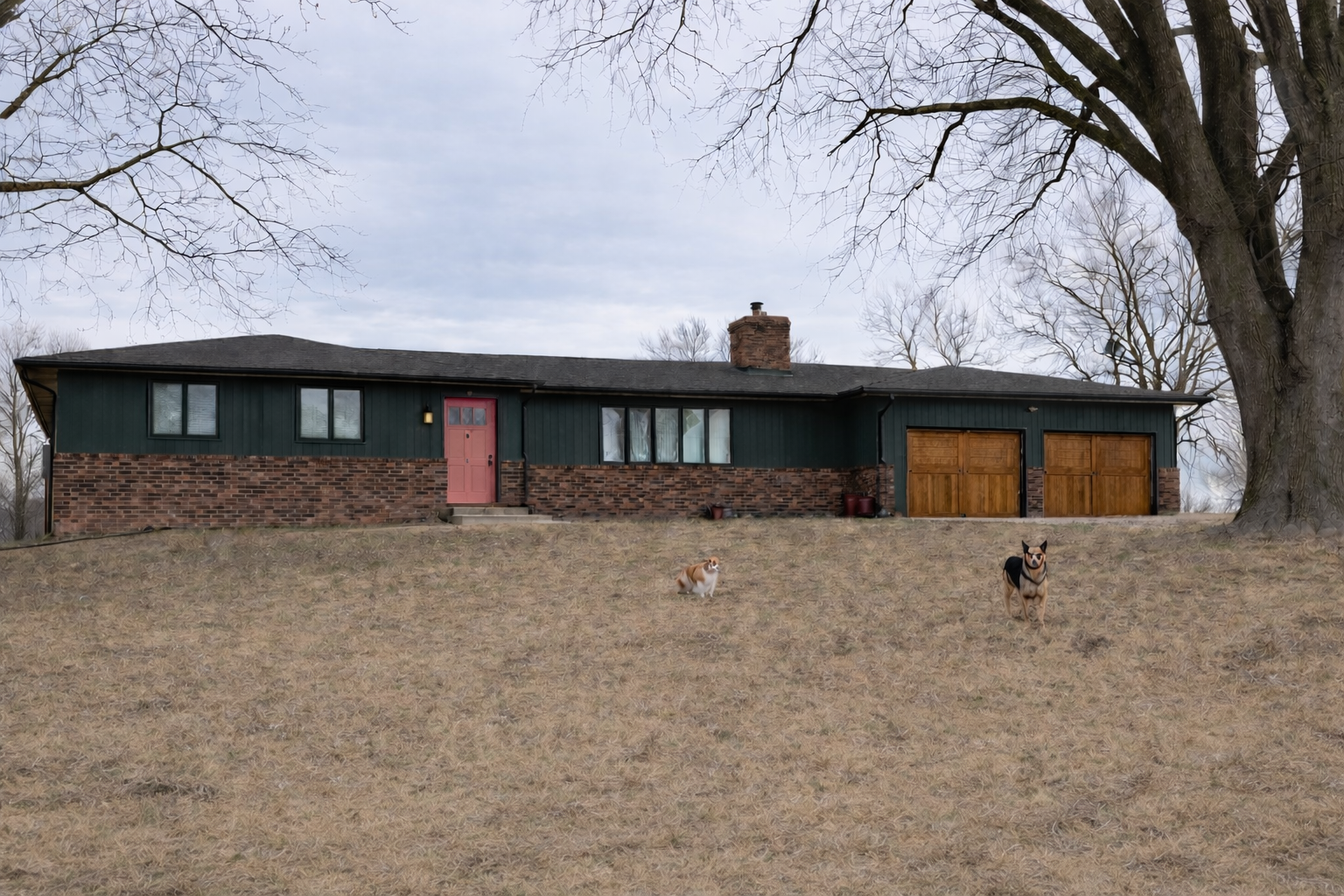 add landscaping and make the garage doors more of a lighter oak transform this architectural interior design drawing into a photorealistic rendering maintain the exact layout dimensions and placement of all elements do not change materials colors or geometry additionally apply a very subtle hand drawn architectural sketch overlay faint pencil line edges around furniture silhouettes cabinetry and key architectural elements as if barely sketched over the photograph keep it extremely subtle the photorealistic image must remain fully dominant