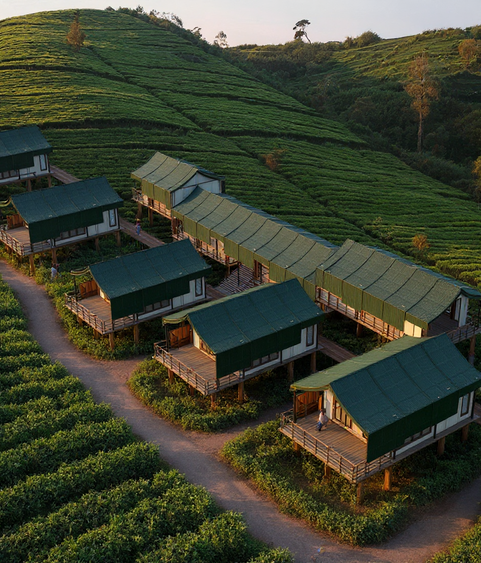 enhance and develop the raw 3d drawing into a realistic render maintain the original building massing and angle the setting is a lush tea plantation integrated with scattered clove trees across the tea terraces as natural visual barriers between the buildings the architecture features tent roofs and stilt construction making each structure float lightly above the tea plantation emphasize the harmony between the elevated buildings and the layered green contours of the site preserve all existing elements from the 3d drawing while enhancing texture light and environmental realism