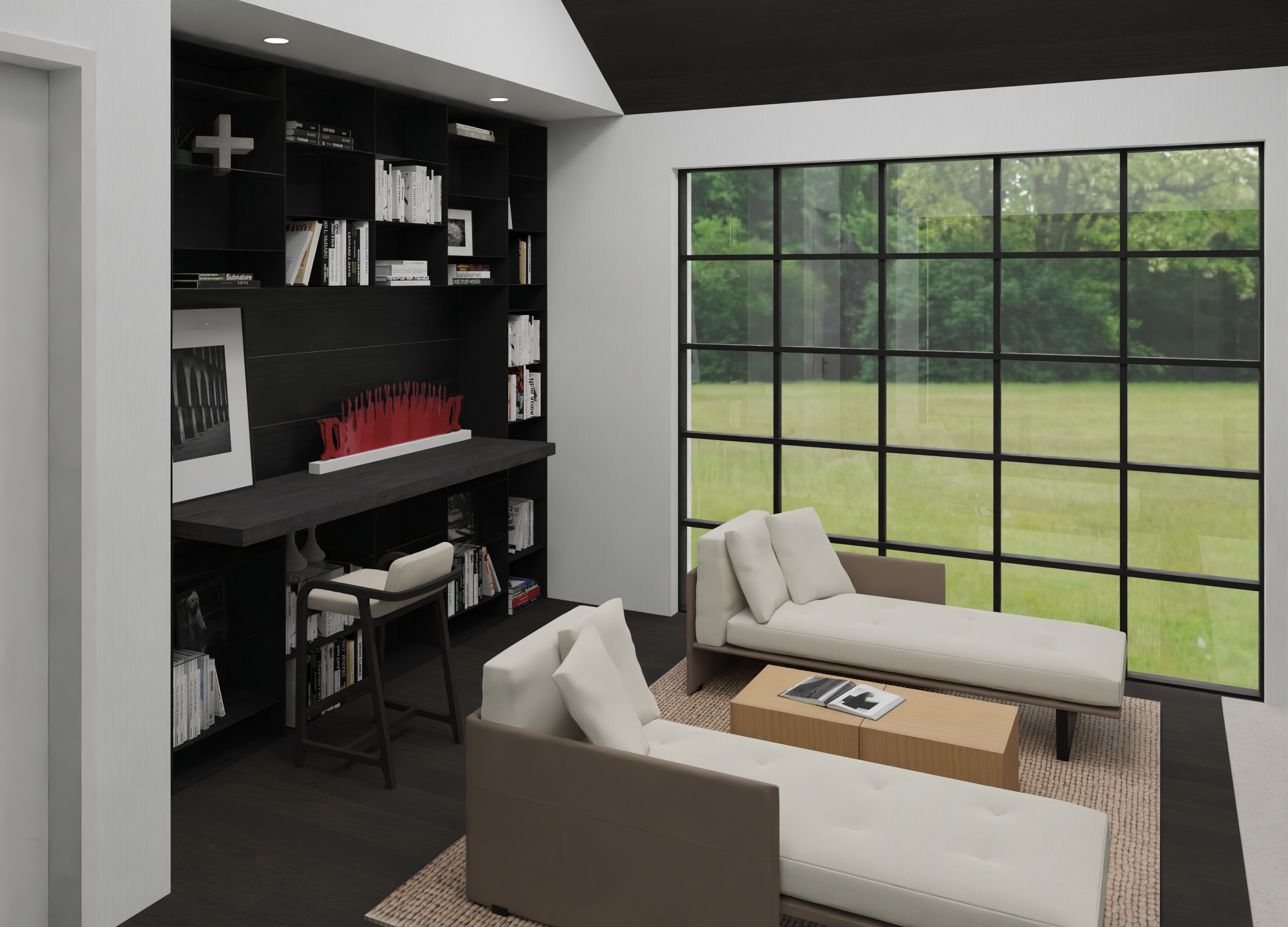 a modern minimalist library design dark oak flooring and matching ceiling complements black wood cabinet that have no lighting within them with a matt black fossil wood desk top and soft seating the design the atmosphere is calm and relaxing accented by lush green hydrangea plant outside the window with lighting that is soft and natural creating a relaxing atmosphere