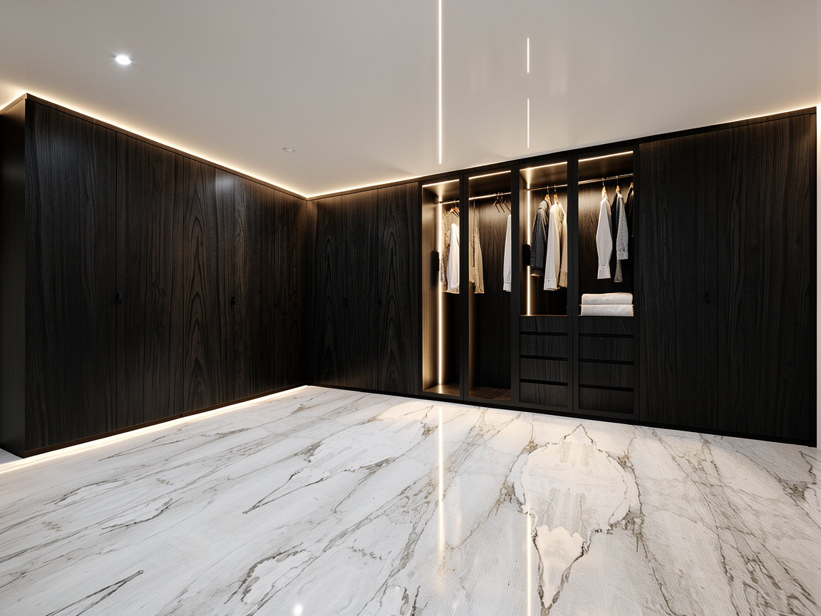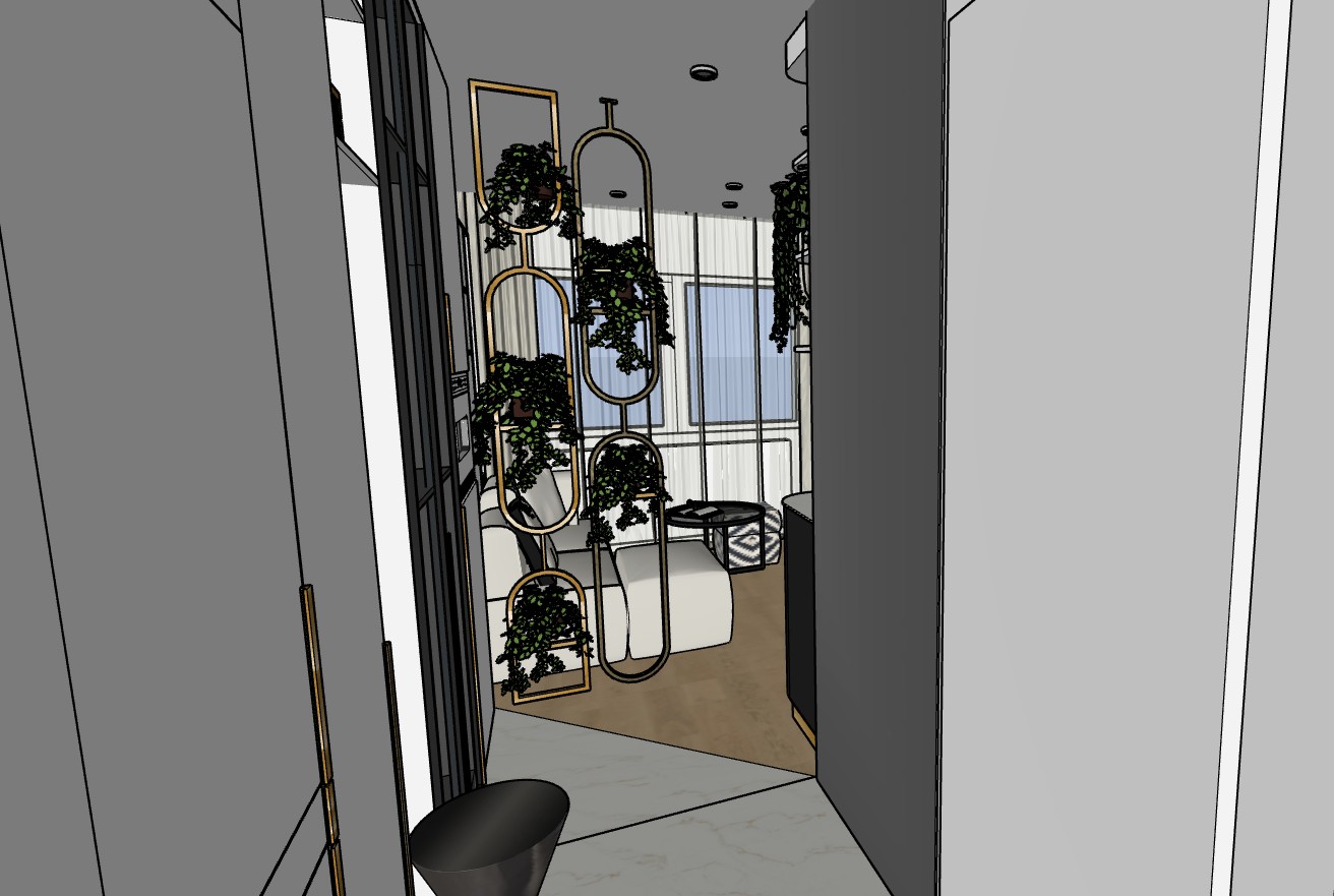 ultra photorealistic render of a contemporary luxury studio apartment entry corridor facing the living area designed for high end real estate marketing camera positioned in the entry hallway looking toward the living room right side features a full height frameless mirror integrated into a flush sliding door panel the sliding door is handle less minimalist with seamless surface no visible hardware no frame and perfectly flush with adjacent wall panels mirror surface is highly realistic physically accurate reflection reflecting plants sunlight and interior space naturally left side features built in floor to ceiling cabinetry in smooth matte light neutral finish with minimal vertical brass accent handles floor transition from light polished marble tile in entry area to warm natural oak wood flooring in living area living area visible beyond corridor includes elegant brass framed vertical plant divider with lush cascading green plants modern modular off white sofa minimalist round coffee table and sheer floor to ceiling curtains lighting is strong natural golden hour sunlight entering from large window casting realistic soft shadows plant shadows and warm light reflections on mirror and walls accurate light bounce global illumination and realistic shadow gradients materials are highly realistic mirror reflectivity physically accurate matte cabinetry brushed brass metal frame soft fabric sofa polished marble floor with subtle reflections natural wood grain flooring mood is warm calm inviting premium real estate photography style camera settings professional full frame camera 24mm wide angle lens eye level height straight vertical lines architectural photography composition rendering quality ultra photorealistic ray tracing global illumination cinematic lighting real world materials sharp focus 8k resolution architectural visualization quality