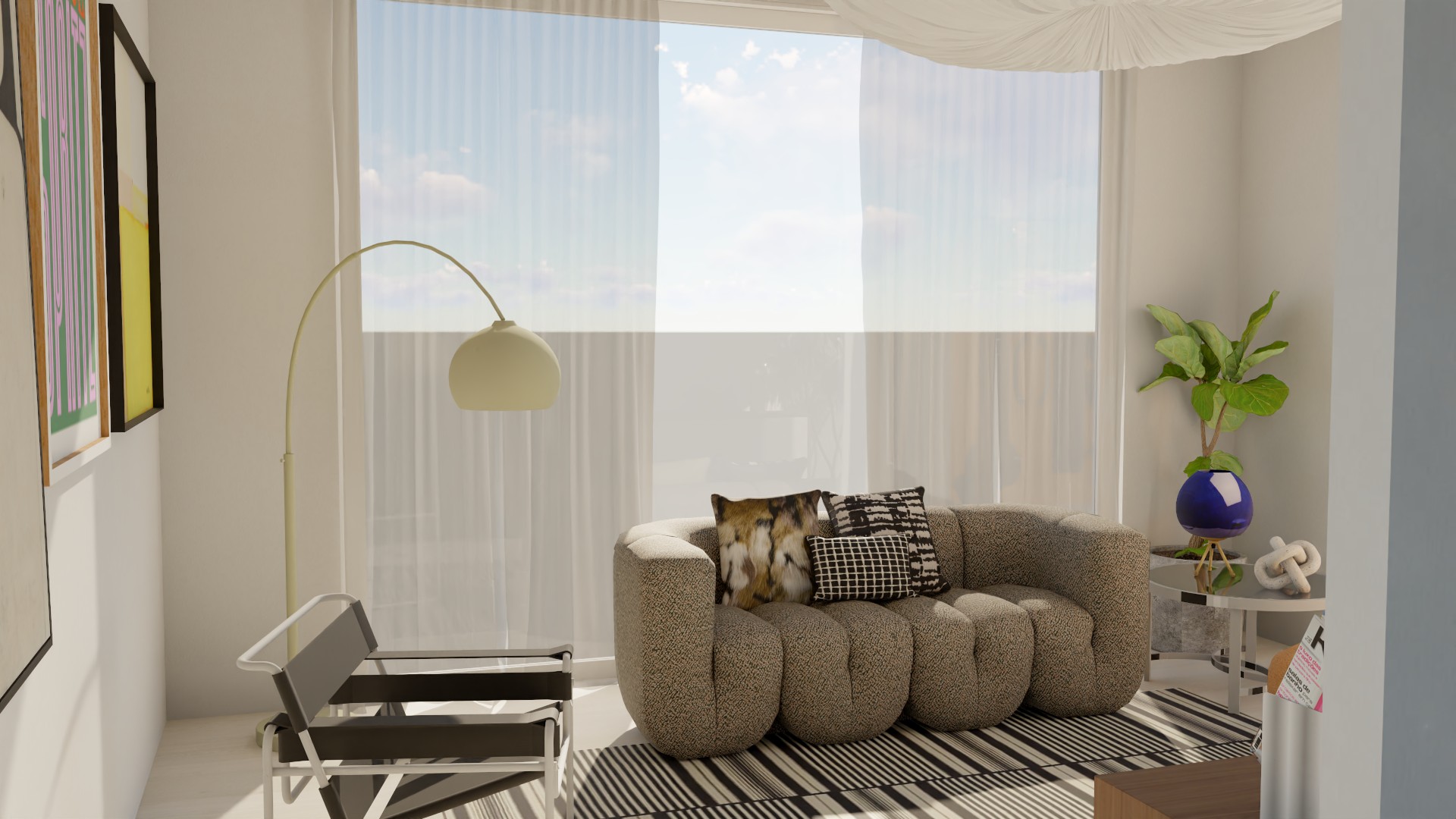 photorealistic architectural visualization based strictly on the provided image preserve all existing geometry furniture materials proportions colors and camera angle exactly as shown do not redesign restyle smooth exaggerate or add new elements enhance realism only through physical lighting and camera behavior natural daylight with accurate global illumination soft indirect bounce light from the floor and walls gentle shadow falloff with subtle ambient occlusion correct exposure and white balance slight edge softness avoid razor sharp lines extremely subtle material roughness variation no new textures lighting conditions late afternoon desert daylight warm neutral tone realistic sun direction soft highlights no dramatic contrast exterior replace view beyond the opening with a realistic desert landscape distant horizon soft atmospheric haze minimal vegetation slightly out of focus camera realism 35mm lens equivalent natural perspective slight depth of field no wide angle distortion final result must look like a real architectural photograph not cgi not concept art not stylized not over enhanced