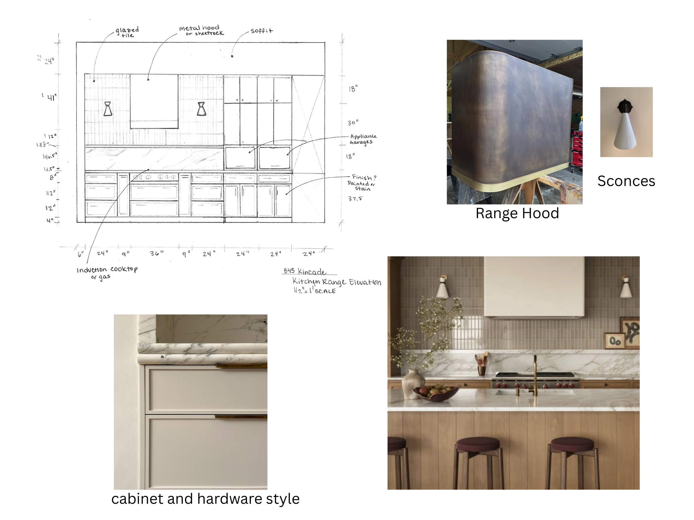create a modern kitchen render with the following elements bronze range hood vertical stacked glazed tile to ceiling marble countertops painted perimeter cabinets white oak kitchen island 1 cabinets and hardware use soft taupe color for the cabinets with elegant brass hardware for a sophisticated touch 2 range hood incorporate a sleek metallic finish with a mix of polished and slightly aged brass tones 3 sconces modern wall sconces with a white and brass design for a minimalistic yet stylish look 4 backsplash feature glazed tiles in a warm taupe hue to blend with the cabinets creating a seamless background 5 countertops use white marble with subtle gray veining for the countertops and backsplash 6 bar stools dark purple upholstery on bar stools with slender wooden legs providing contrast 7 atmosphere the atmosphere should be warm and inviting with a touch of elegance capturing a cozy yet luxurious kitchen setting use soft lighting to accentuate the textures and colors render these elements in a harmonious elegant composition that exudes warmth and modernity