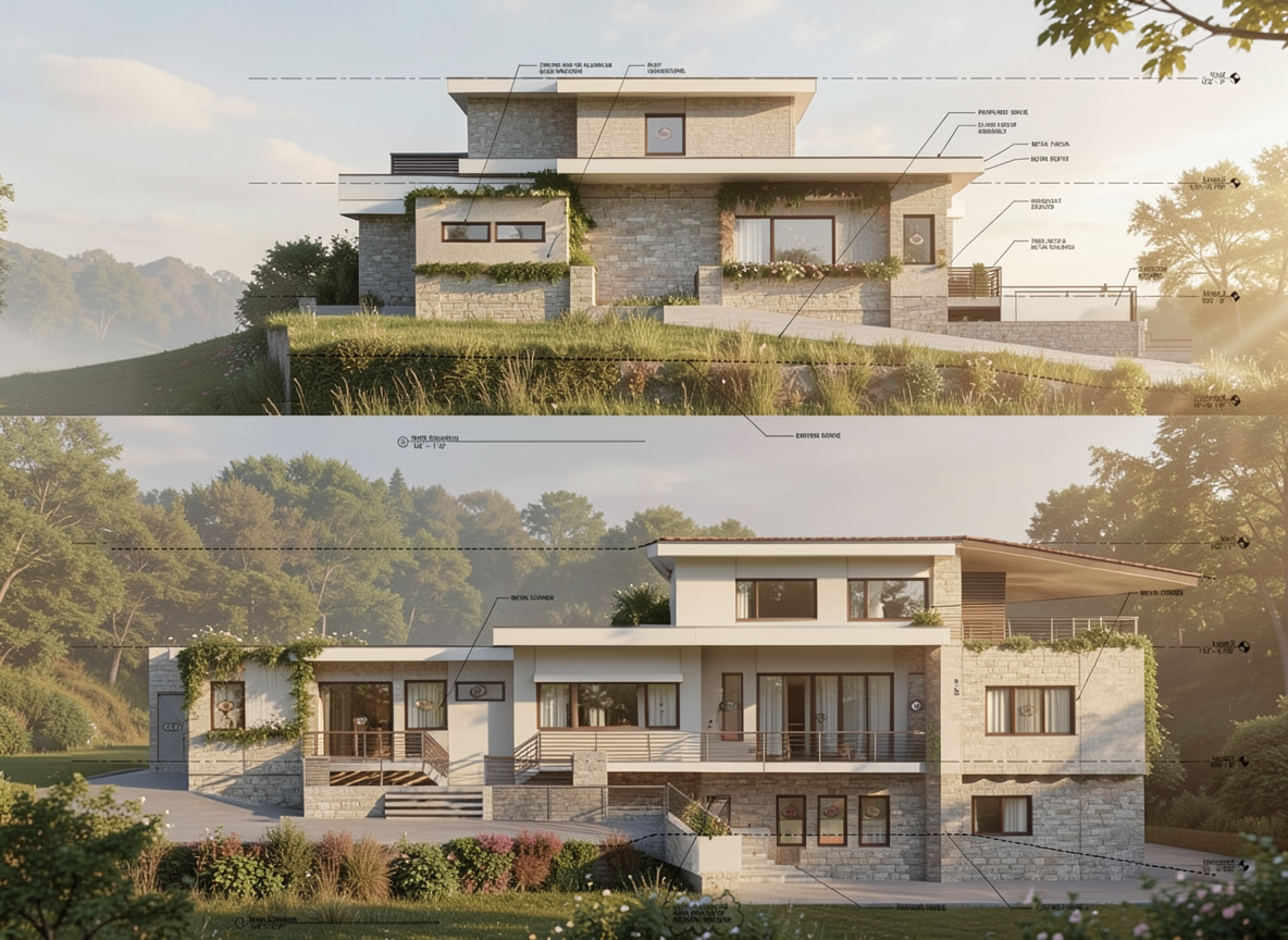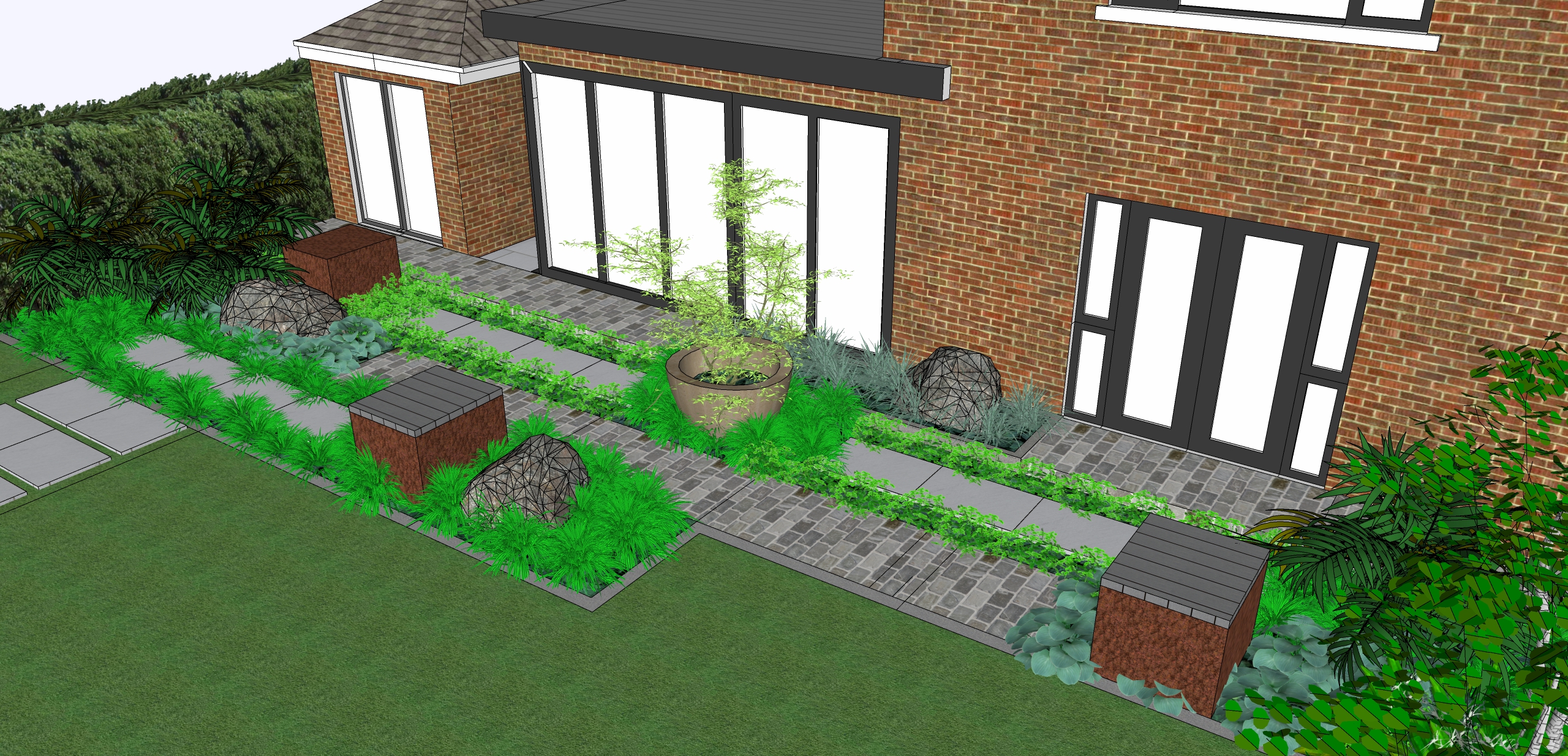 red brick house with dark grey window and door frames flat aluminium roof raised path running along the patio doors are beige sandstone brick setts laid in stretcher bond grey paving slabs and stepping stone flags are light grey porcelain stepping stone flags have low planting running in between all planting to be lush architectural minimal e g hostas tree ferns near hedge japanese forest grass privet hedge in background rusted corten steel cubes two have a grey timber slats for seating the area is in the shade small acer tree in large pot keep the same proportion scale and orientation of the original image stone boulders