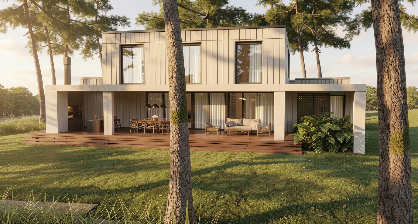 a photorealistic render of a modern style house with clean architectural lines flat roof large floor to ceiling glass windows and a minimalist facade combining concrete wood and glass the house is surrounded by lush greenery including a manicured lawn decorative shrubs and tall trees creating a natural and peaceful atmosphere a modern car is parked in front of the garage realistic natural daylight soft shadows ultra detailed textures high dynamic range lighting 4k resolution architectural visualization professional exterior render highly realistic materials
