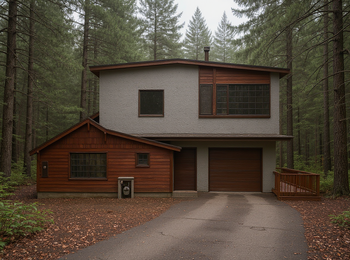 the stucco have semi smooth finish and should have cement grey color similar to concrete the horizontal siding should be redwood siding the shake shingles at the gable should be redwood also the window frames should have dark bronze finish the background should be fir trees show a driveway leading to the garage door show a redwood deck to the right of the garage door without a guard rail maintain all lines do not replace or add new lines