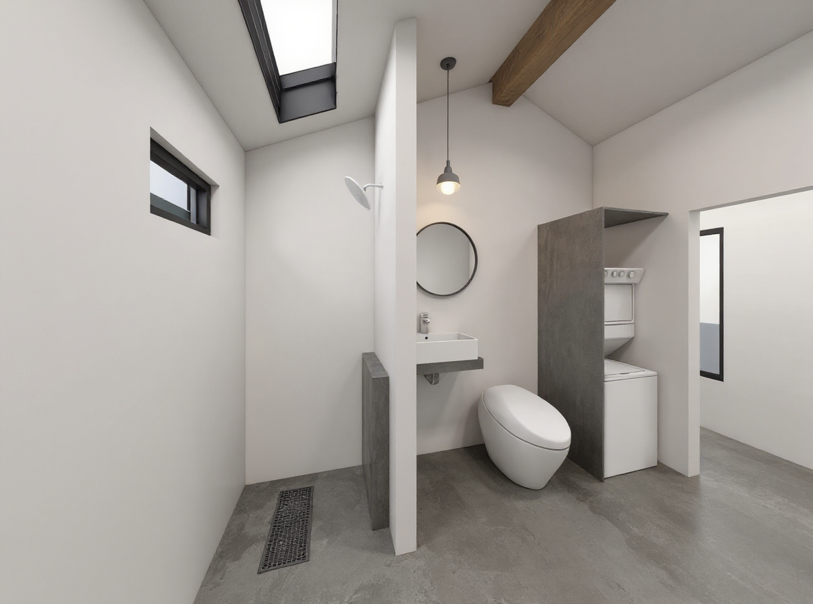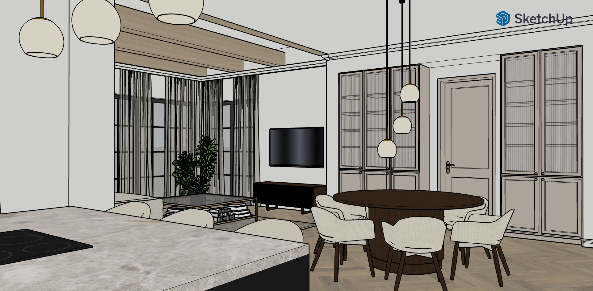 cinematic photorealistic interior render of a timeless modern classic open plan kitchen dining and living area keep the exact same layout and proportions as in the reference image do not change the layout the scene shows a view from the kitchen island with a travertine stone countertop toward the dining and living area in the foreground neutral upholstered bar stools in the center right a round dark wood dining table with six beige upholstered chairs behind the table two tall sand beige display cabinets with fluted glass doors and brass knobs and a matching interior door between them pendant lights with soft beige glass shades hang above the dining area in the background a cozy living corner with a dark walnut tv console wall mounted tv glass coffee table with art books and a lush green indoor plant by the window the space features black framed glass doors with off white sheer curtains and a light oak ceiling accent above the seating zone