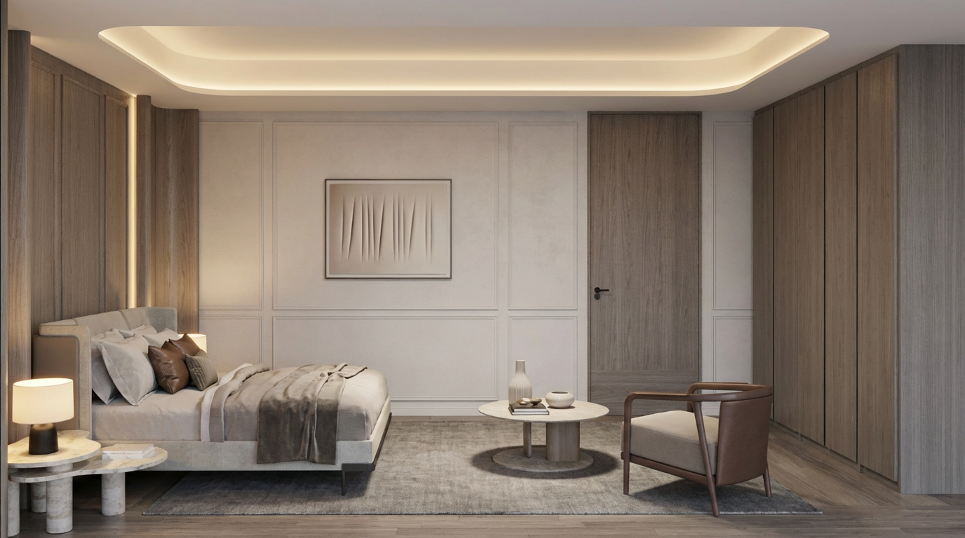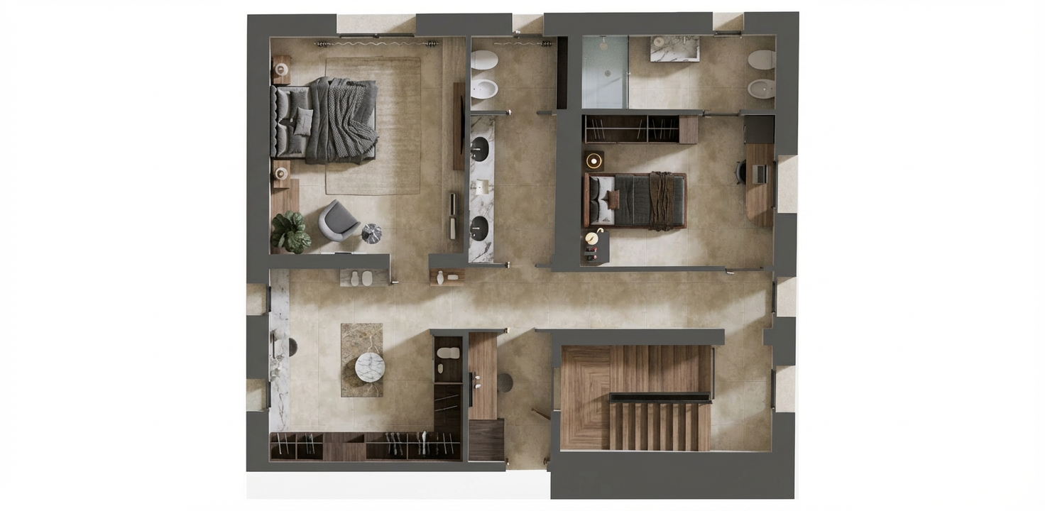 fresh modern bistro interior designed purely as a seating area for approximately 40 50 guests use the provided reference image as the base spatial layout and proportions the atmosphere should feel welcoming fresh contemporary and relaxed walls are primarily clean white plaster one feature wall can use decorative concrete plaster for subtle texture and contrast flooring made of terrazzo ceramic tiles in light natural tones interior palette should stay soft and natural with accents of green seating composed of comfortable upholstered dining chairs combined with small round and rectangular tables arranged naturally across the space include one semi private seating box for approximately 6 8 people designed as a more intimate zone separated by light spatial elements such as wooden slats textile panels or integrated greenery keeping the space visually open but more private lighting design should combine multiple layers modern pendant lights above tables ambient wall lighting soft indirect lighting and decorative lighting elements to create a warm caf atmosphere mirrors can be used subtly on structural columns or selected wall sections to visually enlarge the space and reflect light materials should include natural textures such as light oak wood soft fabrics terrazzo flooring and subtle greenery such as indoor plants the space is intended only for seating and social dining no bar counter should be present style contemporary european bistro scandinavian inspired modern interior warm minimalism elegant but relaxed hospitality design photorealistic architectural interior rendering soft daylight combined with warm ambient lighting wide angle interior view no gree chairs