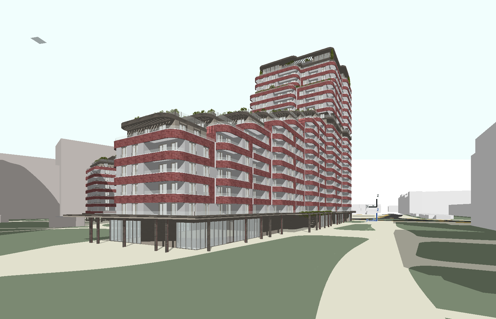 apply the following json format prompt to the image without changing the perspective keep the geometry as it is medium and signature medium type photorealistic architectural visualization architectural typology building function mixed use residential building geometric form stepped terraced podium with tower area key elements layered terraces repetitive balcony grids rooftop gardens podium glass railing lightgrey plaster insets between windows red color scheme brickwork granite closing slab of terraces vegetation tower area glass railing lightgrey plaster insets between windows red color scheme brickwork granite closing slab of terraces vegetation groundfloor vegetation granite closing slab granite walls park vegetation architectural style movement contemporary urban residential architecture weather season early spring time of the day sunny day sky slightly cloudy vibe cinematic color palette grading style high detailed neutral colors atmospheric quality mood clean and analytical lighting hardness soft diffused daylight