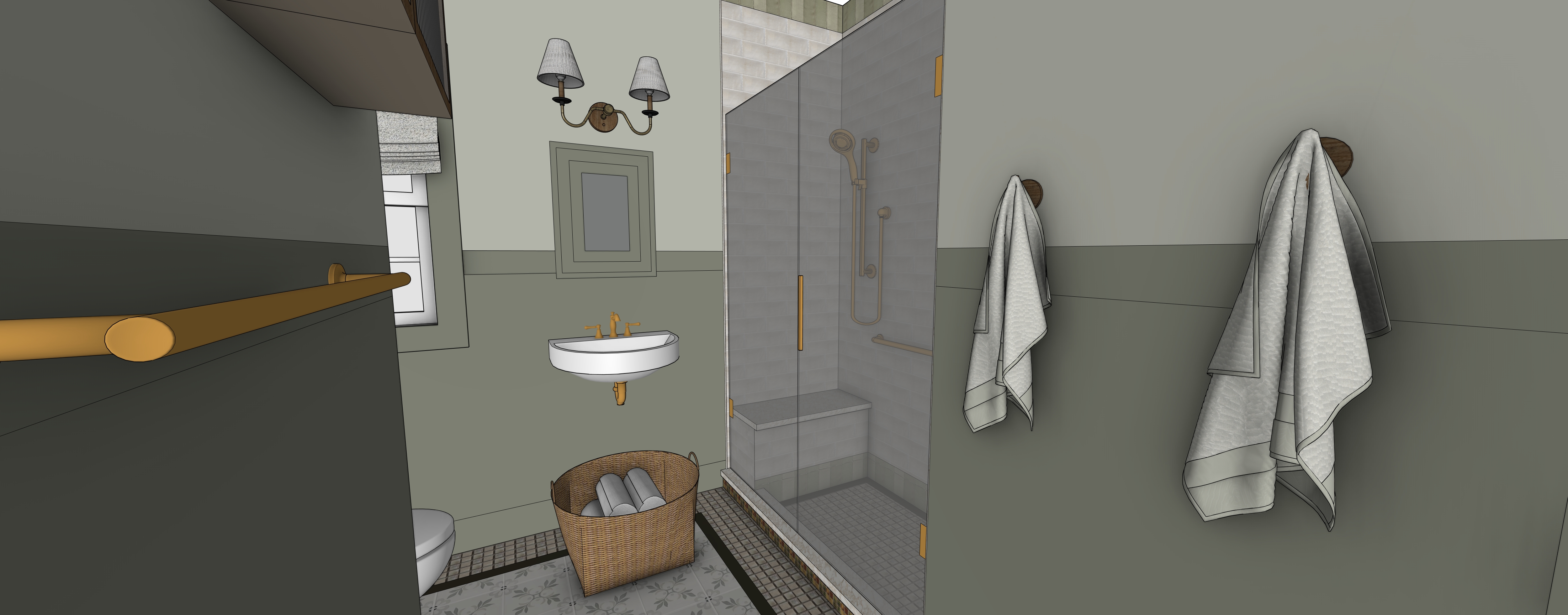 bathroom with two tone wall color patterned tile in the middle of floor maintain all colors patterns and layouts only make look more realistic with lighting and a slightly glossy texture on tile add realistic lighting at vanity sconce add gentle ambient overhead lighting like from a recessed can light add gentle natural light from the window