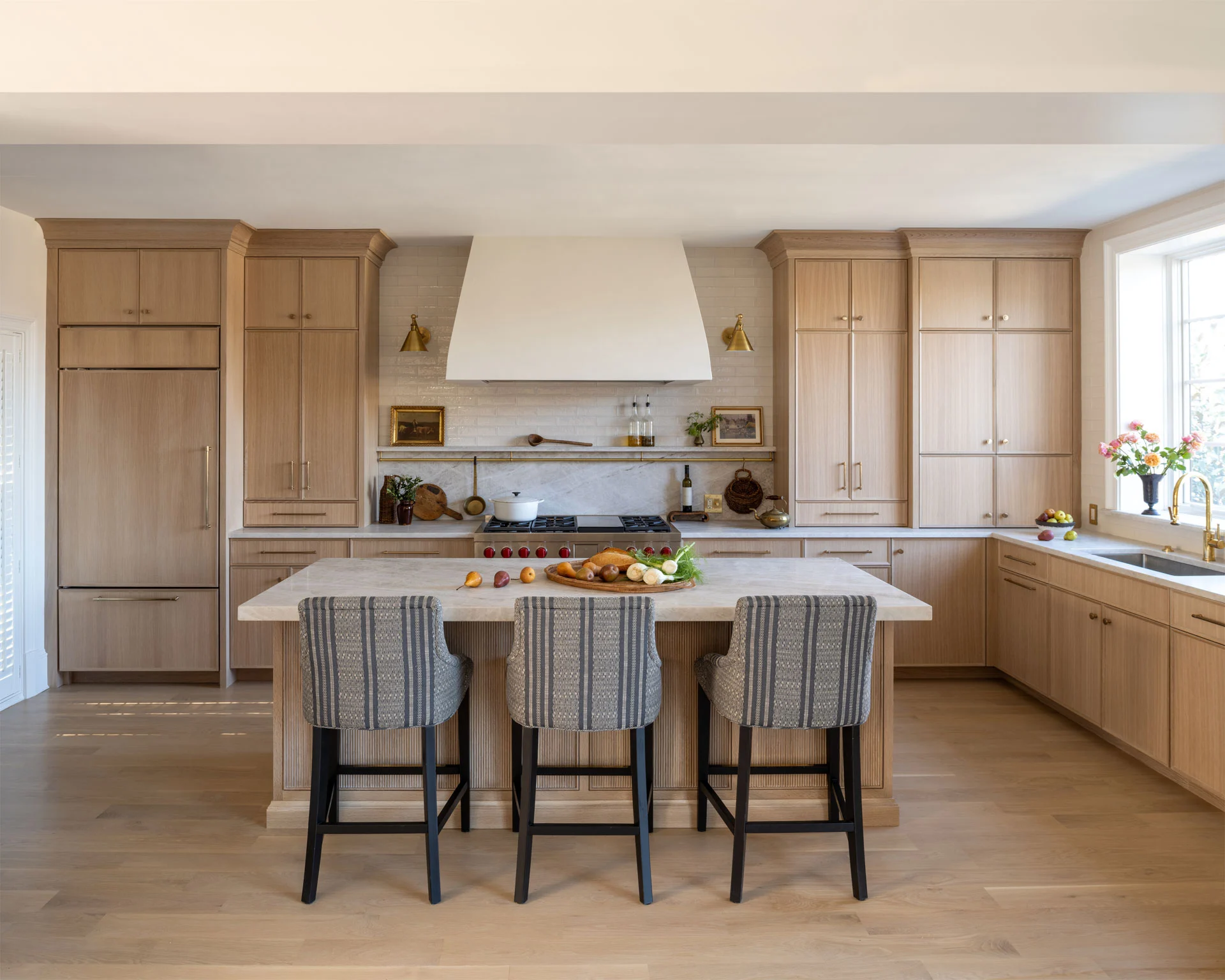 exterior shot this kitchen should have shaker style cabinets with matt black handles all the cabinets except the island will be made of white oak the island should be a dark stained hardwood the upper cabinets go all the way to the ceiling make the countertops a beautiful marble the floors are a nice medium light wood