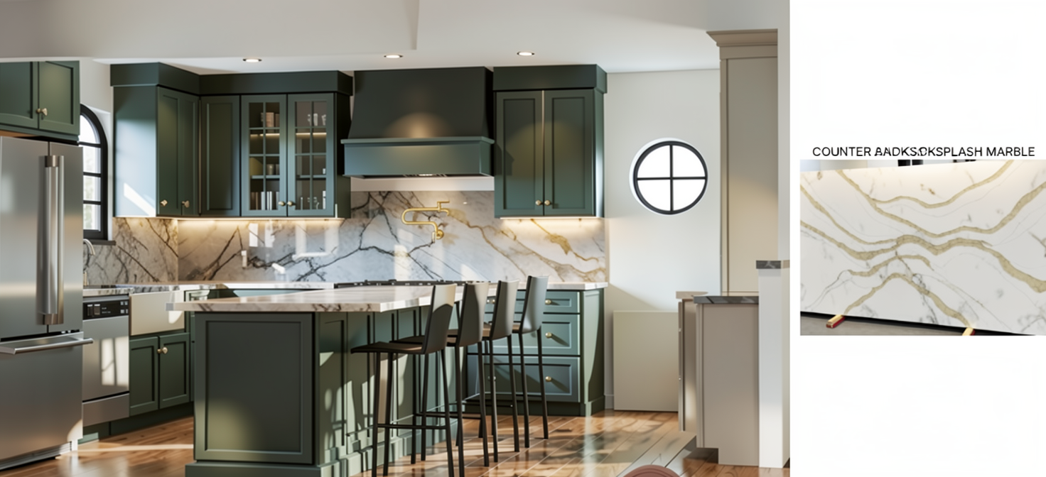replace the countertop and backsplash marble with the exact marble shown and labeled as counter and backsplash marble make it look like the exact same as the photo
