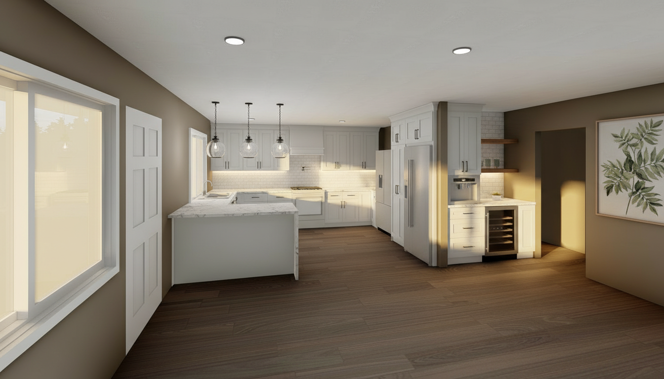 i want the kitchen to be in a farmhouse modern with white shaker cabinets and a marble counter top the nook will house a beverage or wine area add better lighting for the interior rendering and add pendant lights over the peninsula add a wall art as needed keep walls locations appliances will remain in same location add furniture in living room area and make front door look better you may change the wall color do not move door location or windows
