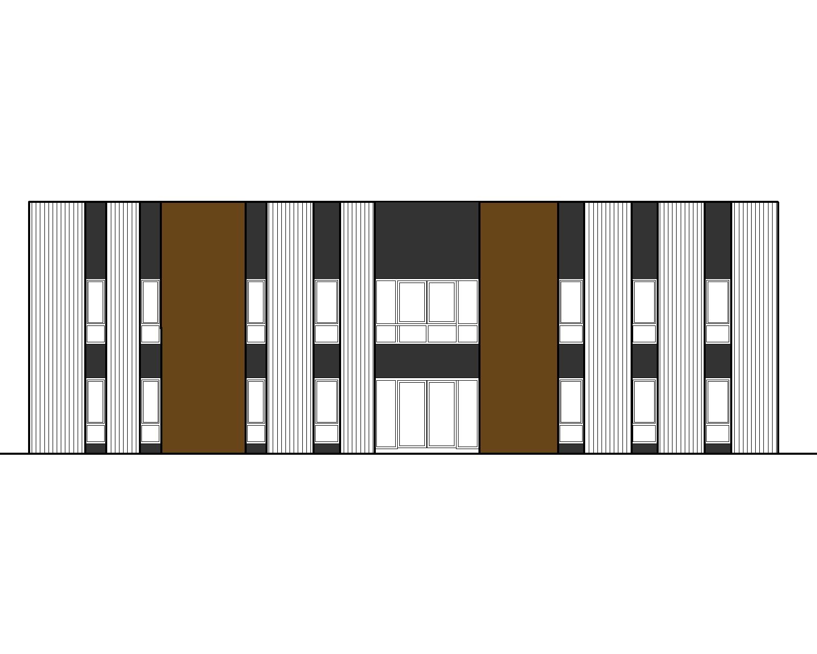 modern exterior shot render a modern building industirial office facade with vertical stripes using a combination of sleek charcoal gray and crisp white for the outer panels incorporate large reflective glass windows with a hint of blue tint set against a clear sky with a soft sunset ambiance casting warm golden light on the building add subtle greenery around the base for a touch of nature while maintaining a clean and minimalistic atmosphere architecture