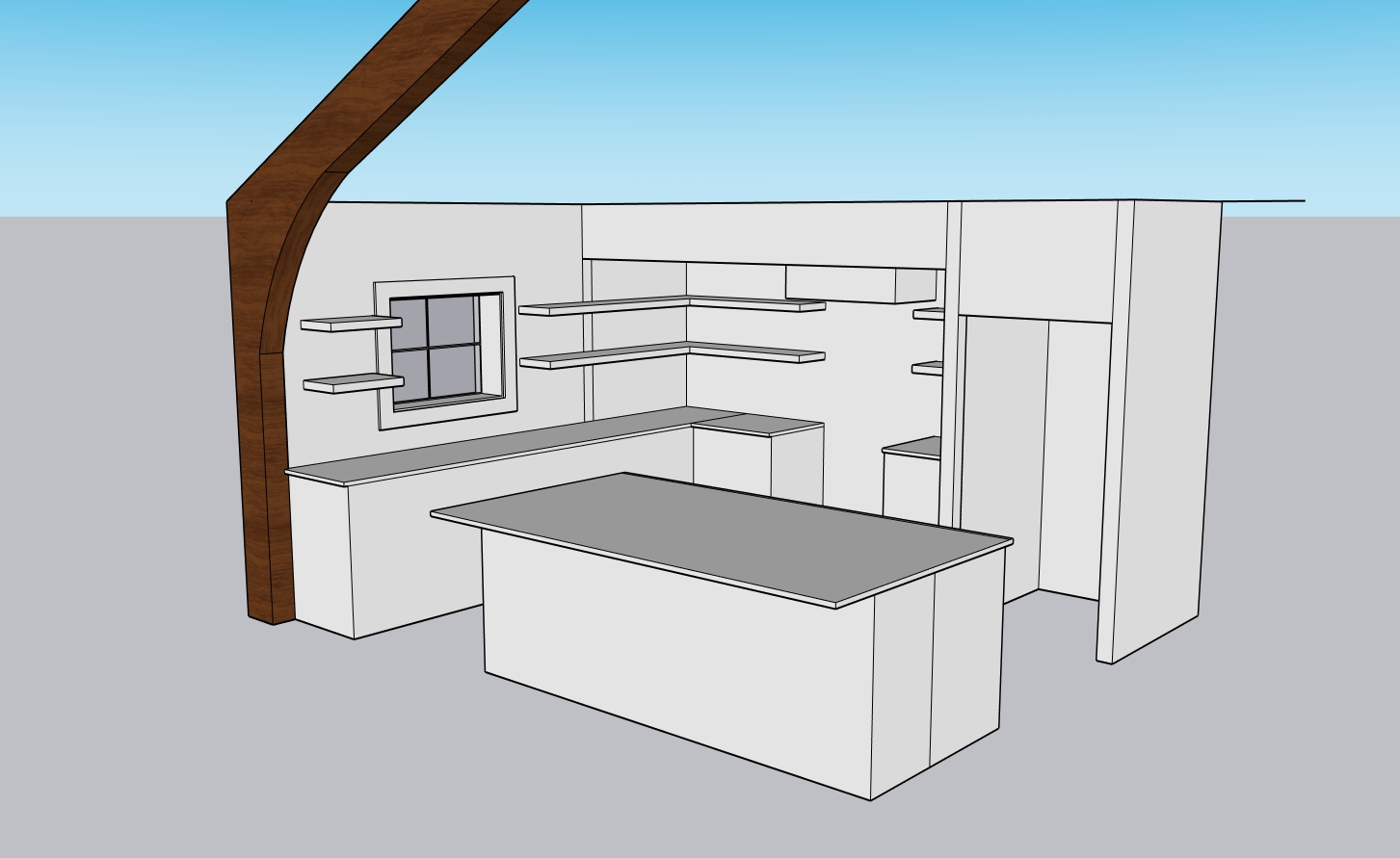 farmhouse style kitchen with floating shelves sink under window white subway tile back splash white counters wolf range samsung fridge in alcove bar stools in front of island white cabinetry and wood flooring architecture